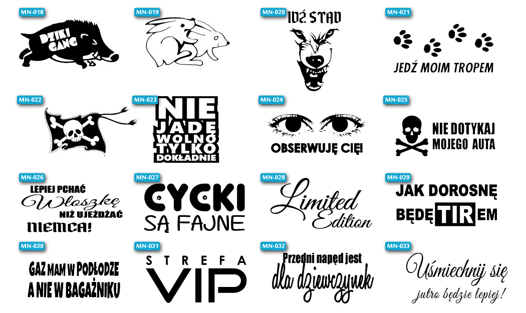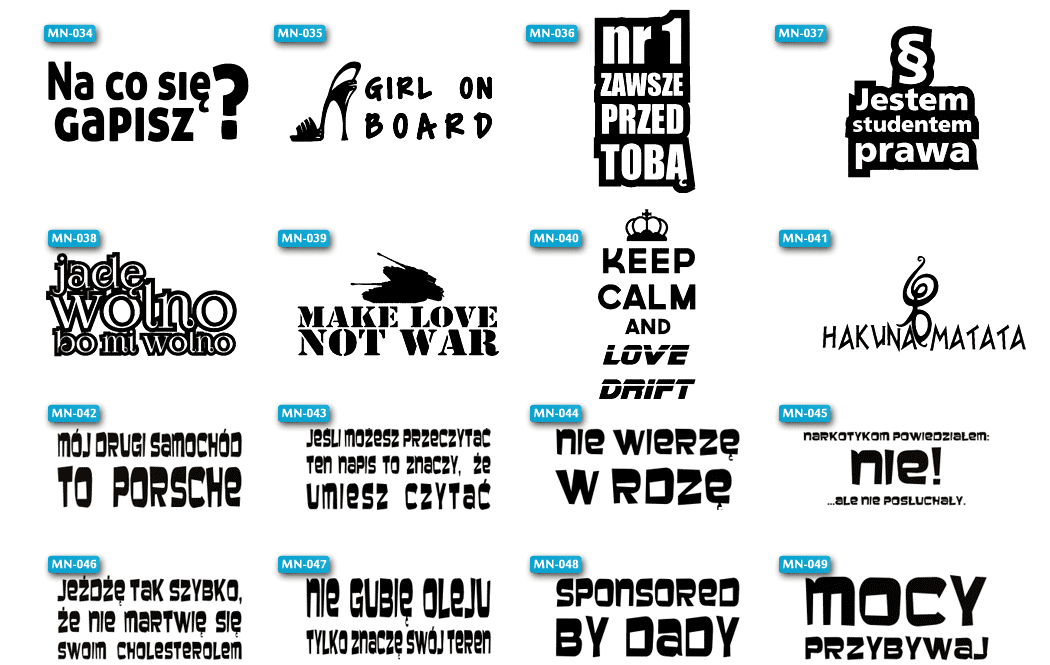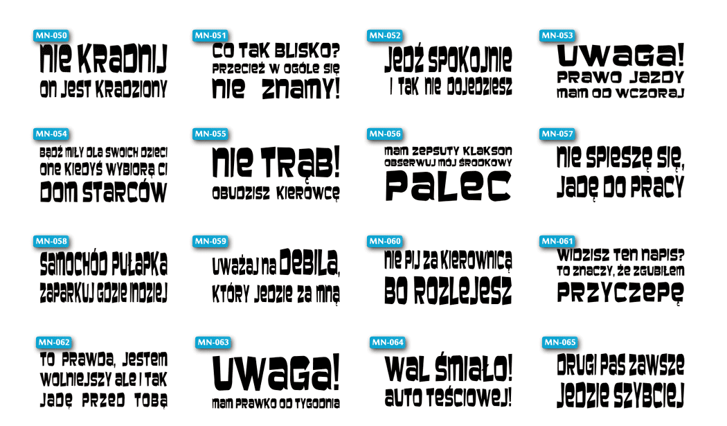Tu kupisz naklejki ze śmiesznymi napisami przeznaczone do naklejania na samochód (choć nikt nie zabroni ich naklejać gdzie indziej ;) ).