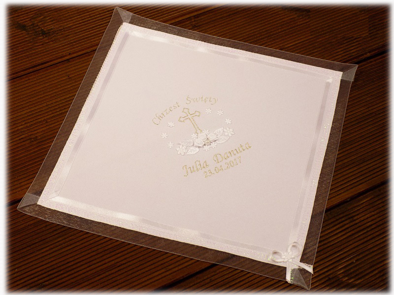 W skład zestawu wchodzi: biała szatka w kształcie kwadratu z wyhaftowanymi imionami i datą Chrztu Dziecka oraz dekoracją.