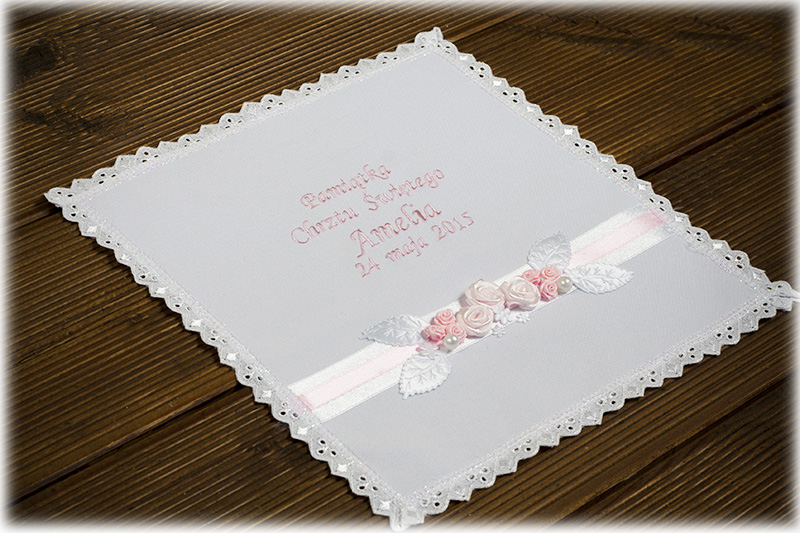 - Szatka do Chrztu w kształcie kwadratu, z personalizowanym haftem i dekoracją. Haft w kolorze rózowym, różyczki różowe, listki białe, umieszczone na szerokiej białej i cienkiej różowej tasiemce. Szatka obszyta jest haftowaną koronką w kolorze białym.