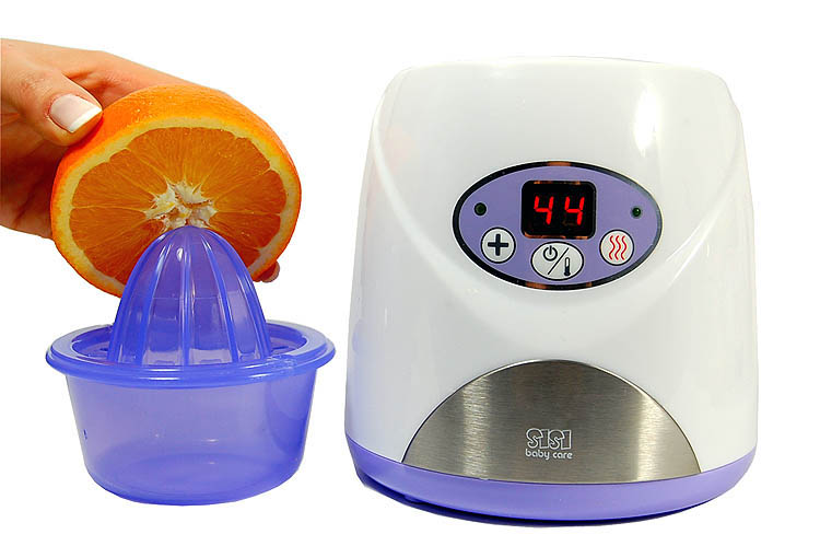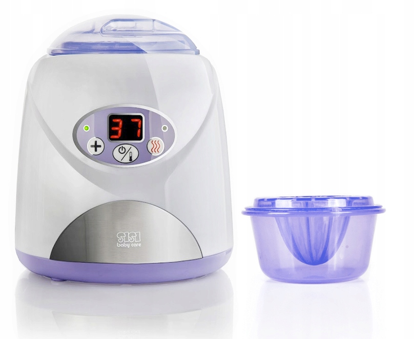 Podgrzewacz marki SisiBaby model SBC-002E z wyświetlaczem LCD. Podgrzewacz pełni funkcję podgrzewacza, sterylizatora oraz wyciskarki do soków.