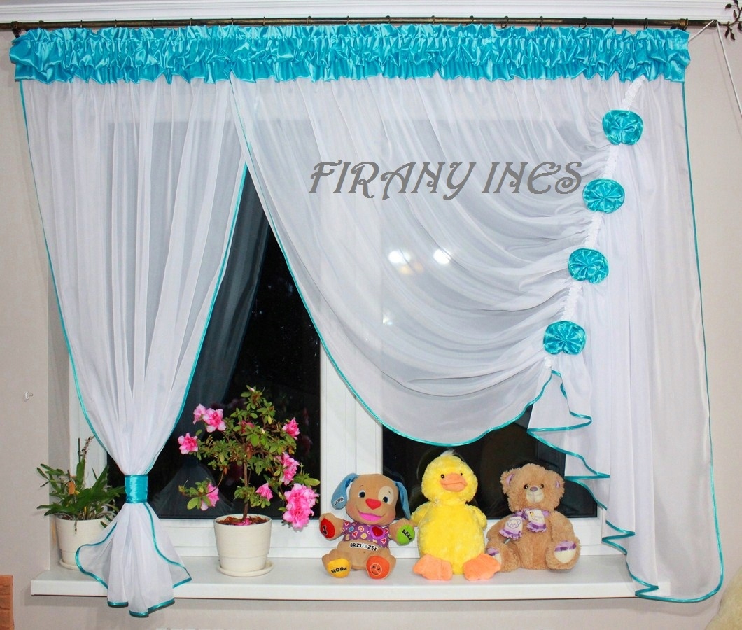 Firana obszyta jest Turkusową lamówką. Wykonana z waolu.