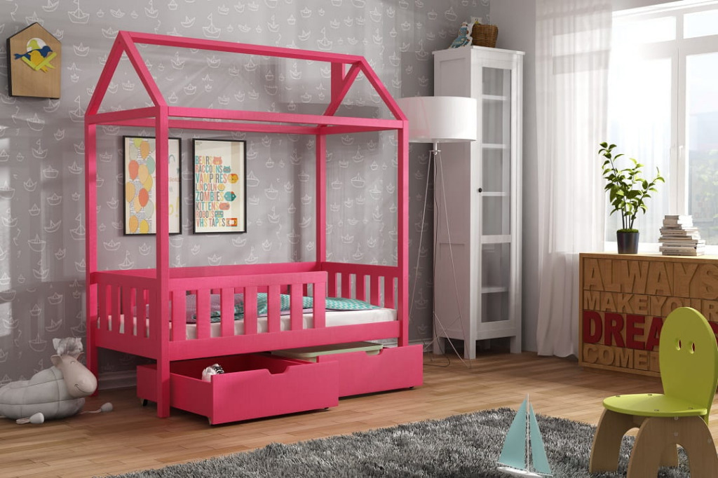Колесо дерев'яного будинку для однієї особи - це пропозиція для людей, які цінують гарний зовнішній вигляд, комфорт і безпеку використання. Цікавий дизайн ліжка у формі будиночка виправдає очікування кожної дитини. Виріб буде для дитини місцем для відпочинку та ігор, тим самим стимулюючи її творчі здібності. Меблі складаються з рами та рейок, щоб дитина не вислизнула під час сну. Залишився вільний простір дозволить дитині вільно вставати з ліжка. Додатковою перевагою є висувні ящики, які допоможуть підтримувати порядок у кімнаті. Модель доступна в декількох розмірах і кольорах. Матеріали, які використовуються для виготовлення - це натуральна деревина сосни найвищої якості. Пропонована модель була тричі пофарбована, а фарби використані екологічні, без запаху та відповідають усім необхідним стандартам.
