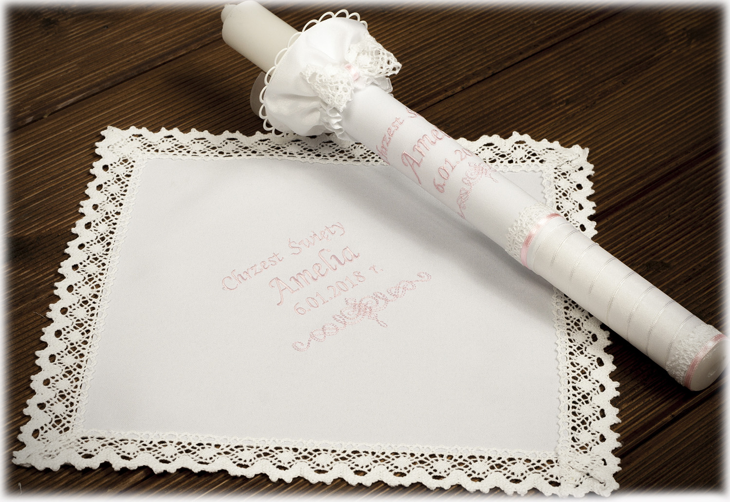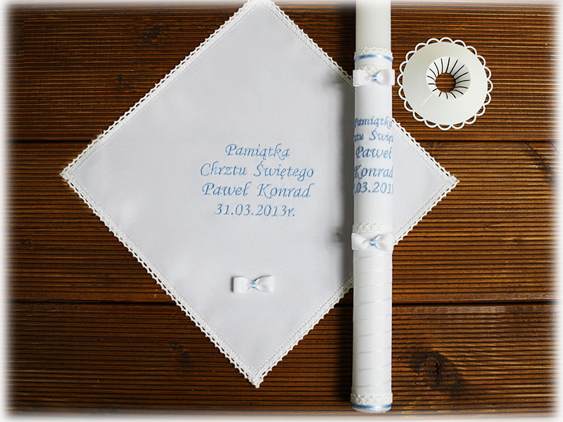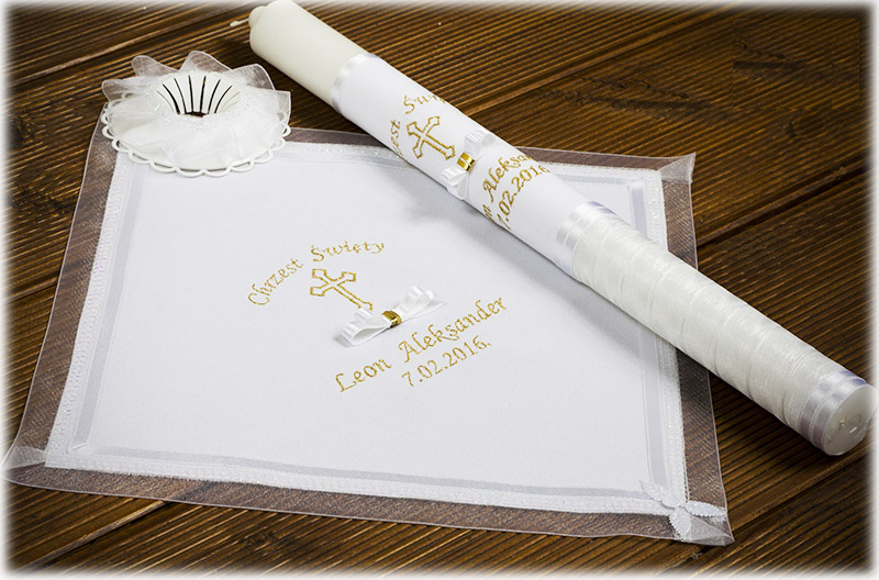 W skład zestawu wchodzi: biała szatka i świeca, z wyhaftowanymi imionami i datą Chrztu Dziecka, okapnik i pudełko na świecę.