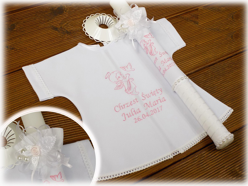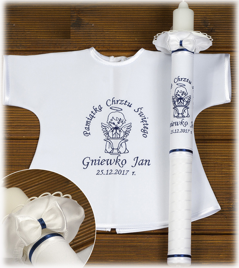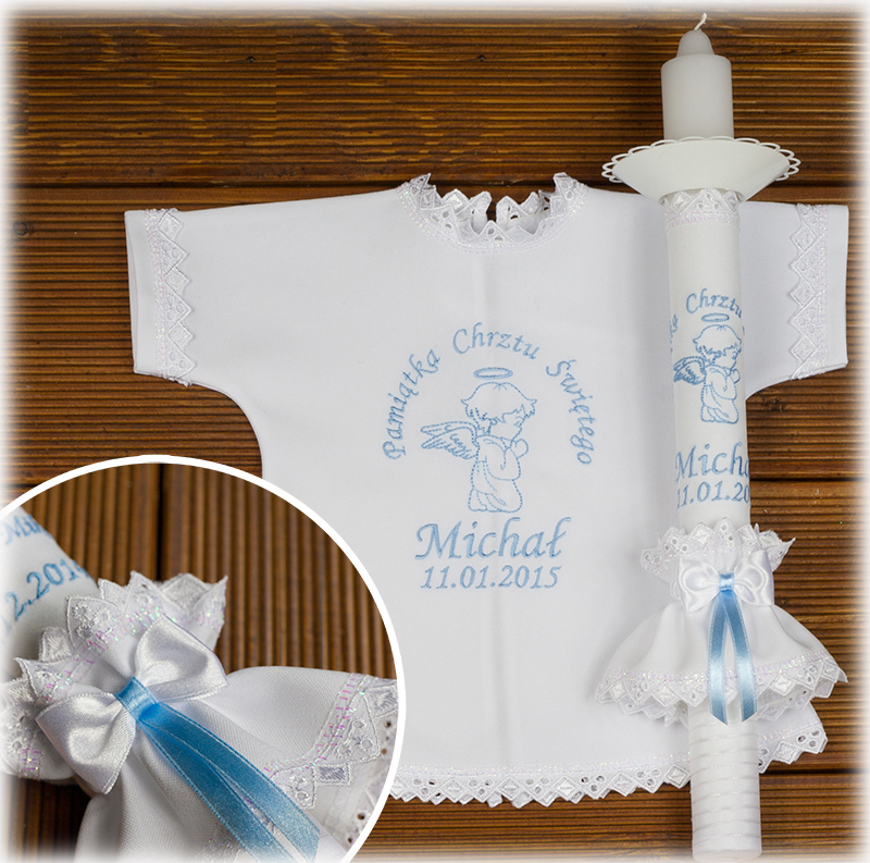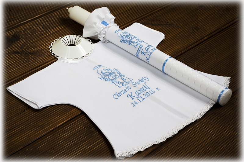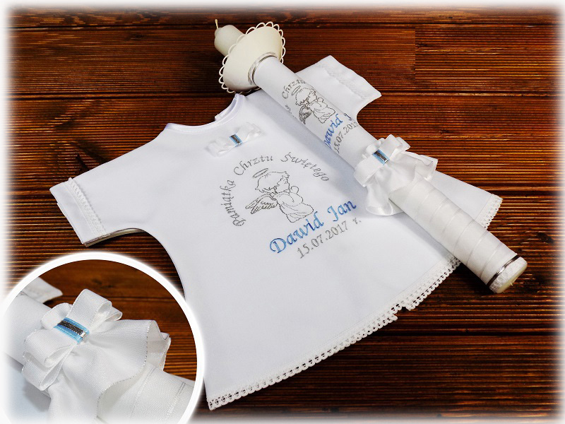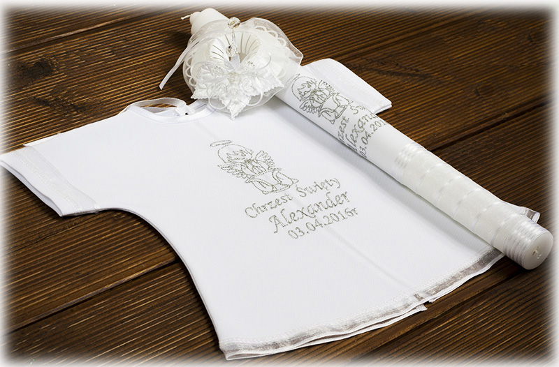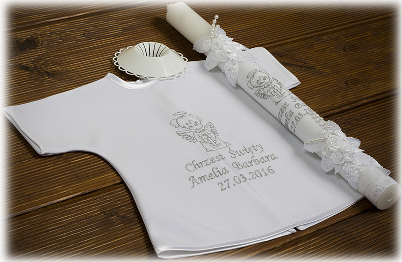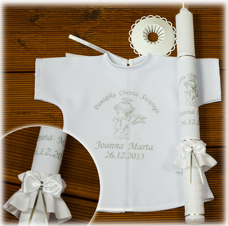W skład zestawu wchodzi: biała szatka w kształcie koszulki i świeca, z wyhaftowanymi imionami i datą Chrztu Dziecka.