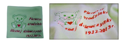На ковдрі ми вишиваємо надісланий вами малюнок і напис. Картинки - це іграшкові ведмедики в різних позах, розроблені в нашій студії. Ми вишиваємо ведмедиків коричневим кольором з носиком і лапками кольору екрю, а аксесуари, такі як повітряний змій, підбираємо під колір ковдри і обраної нитки. Якщо ви хочете ведмедика іншого кольору, напишіть, будь ласка, якого кольору, звісно вишивку зробимо. Ми вишиваємо написи над іграшковим ведмедиком, під іграшковим ведмедиком або поруч, ви можете покластися на наш досвід в оформленні або вирішувати самі, як має виглядати вишивка. Максимальний розмір поля вишивки на ковдрі 200х240мм, при створенні проектів ми завжди намагаємося максимально заповнити цей простір вишивкою.