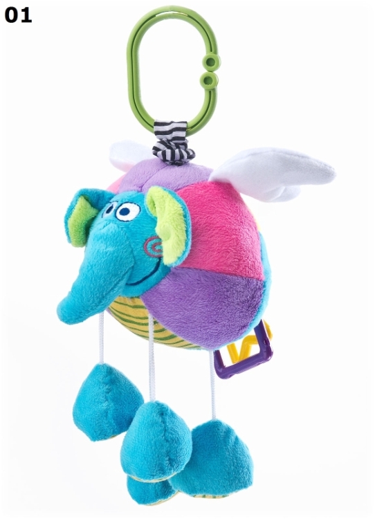 Po pociągnięciu za zawieszkę uruchamia się kojący moduł wibracji. Dodatkowo skrzydełka słonika przyjemnie szeleszczą. Kolorowe elementy zabawki pomogą dziecku w nauce rozpoznawania barw, a praktyczna zawieszka pozwoli na umieszczenie słonika na wózku, łóżeczku lub kołysce.