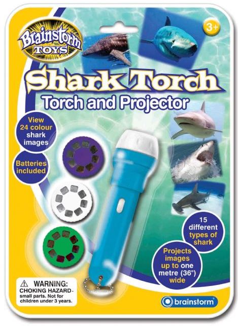 Poręczna latarka jest również projektorem slajdów. W zestawie 24 kolorowe zdjęcia rekinów, trzy wymienne dyski ze slajdami.