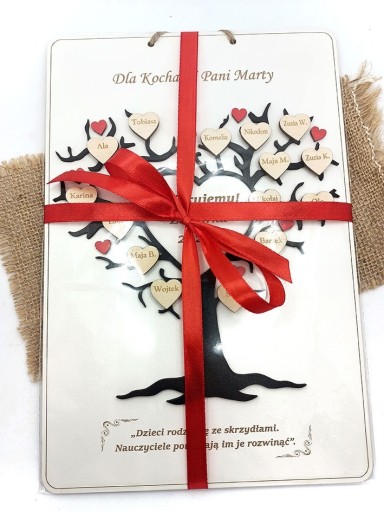 Красива біла табличка 20х30 см, прикрашена чорним деревом з фанерними сердечками, на яких замість листочків написано імена дітей. Табличка - ідеальний подарунок вчителю на кінець навчального року або з будь-якої іншої нагоди.
