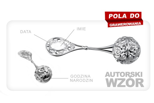 Брязкальце - ідеальний подарунок на хрещення або як сувенір на народження як для хлопчика, так і для дівчинки. Виготовлений повністю зі срібла 925 проби (перевірено Варшавським пробірним бюро), він стане унікальним подарунком. Безкоштовне гравіювання на брязкальце, футляр і будь-яке присвята до скриньки.