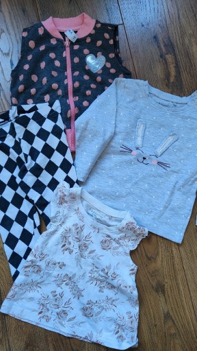У наборі 14 предметів одягу для дівчаток 74 розміру тобто 6-9 місяців. Деякого одягу вистачає надовго. Різних брендів, в основному Смик, Сінсай, 5 10 15. Тільки рожевий світшот без застібки, інший одяг в дуже хорошому або ідеальному стані. Все видиме 45 зл.