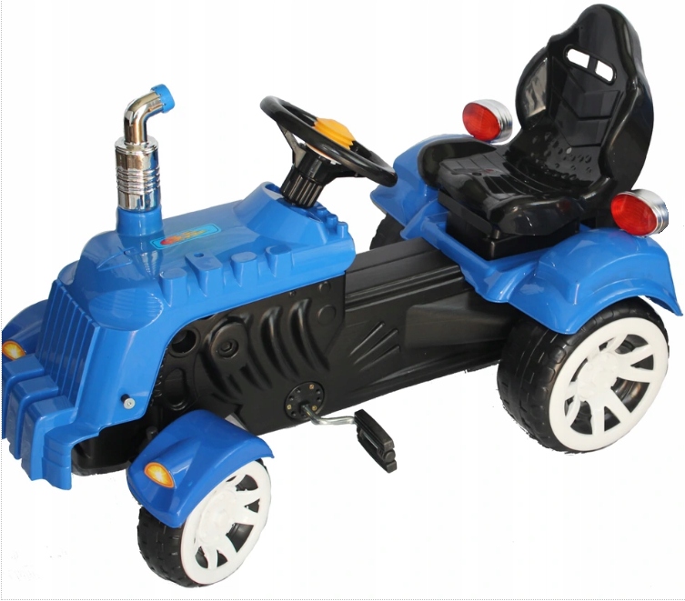 Przednia oś skrętna za pośrednictwem kierownicy wyposażonej w klakson. Dodatkowymi gadżetami są reflektory, komin, osłony na koła i hak dzięki czemu traktorek przypomina prawdziwy pojazd. Do traktorka można przypiąć przyczepkę, która wyposażona jest w ruchomą skrzynię załadowczą, co ułatwia jej szybkie opróżnianie.