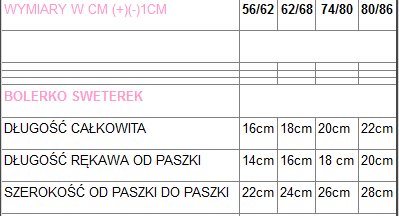 РОЗМІРИ В СМ (+)(-)1CM56/6262/6874/8080/86 BOLERKODUGO CAKOWITA21cm23cm25cm27cm ШИРИНА ВІД СТРУЖКИ ДО СТРУЖКИ24cm27cm29cm30cm ДОВГИЙ РУКАВ ВІД СТРУЖКИ14cm15cm16cm18cm