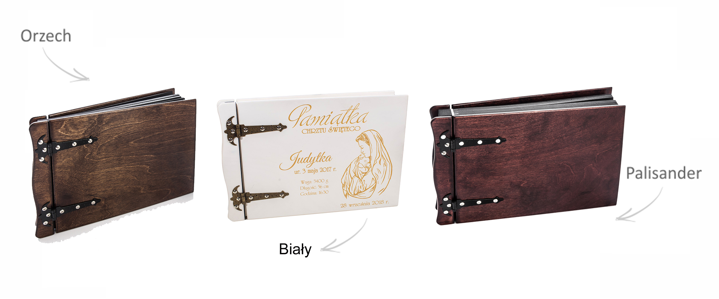 Wykorzystujemy dwa kolory bejc: orzech oraz palisander. Ciemne odcienie idealnie podkreślają kolor grawera. Na pozostałych aukcjach znajdziesz inne kolory okładki: biały, czarny lub naturalny.