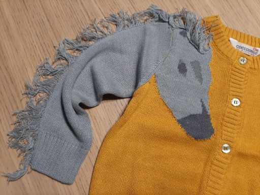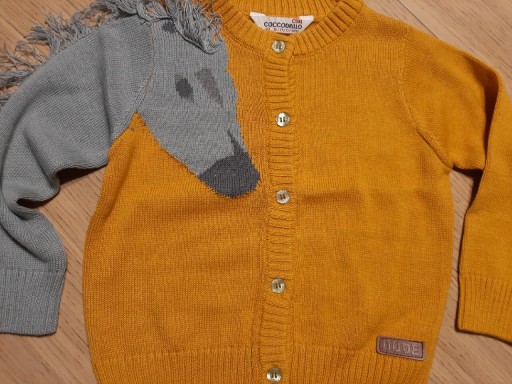 Светр 92 розміру, ідеальний для дівчинки 2-3 років, солодкого, медового кольору з елементом сірого коня та пишною сивою гривою, застібка на 5 гудзиків, рукави та низ. светр на зав'язках.