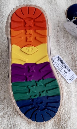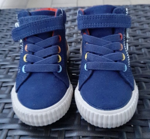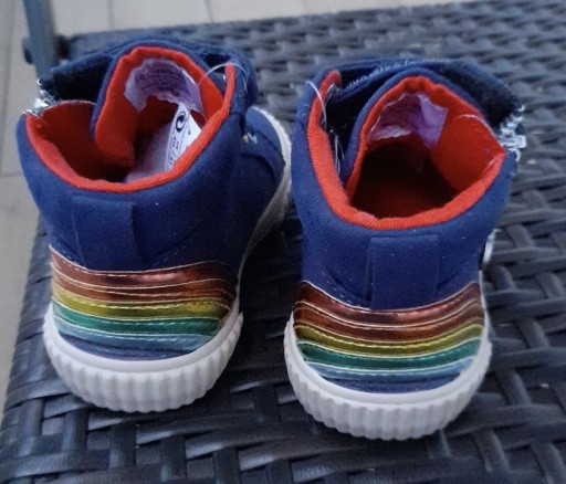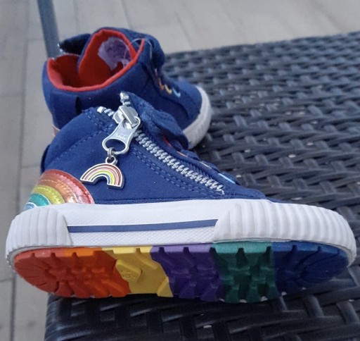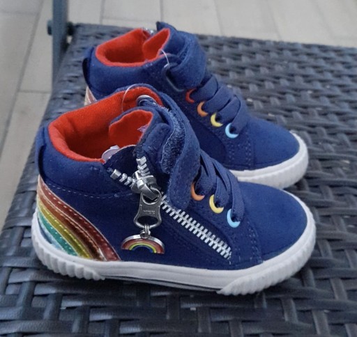 Нові темно-сині високі туфлі. Фірний Далі. Розмір 21. Шнурки та липучки спереду. Різнокольорові дірочки для мережива. Бічна застібка-блискавка з підвісною веселкою. Різнокольорові смуги, що створюють веселку на напої. Всередині взуття червона вставка, яка запам'ятовує форму стопи дитини. Низ у кольорах веселки.