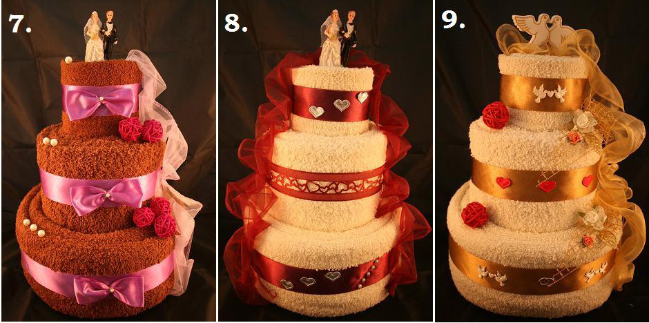 Torty dostępne są w szerokiej kolorystyce dekoracji:złota, miedziana, ecru, zielona, bordowa, czerwona, różowa, fioletowa. Poniżej przedstawiamy Nasze przykładowe realizacje, jeśli wybiorą Państwo któryś z poniższych modeli robimy je w kolorystyce jak na zdjęciu, jeśli pragną Państwo zmienić kolor ręczników lub dodatków prosimy nam o tym napisać, zrobimy tort specjalnie na Państwa życzenie. Każdy tort robimy bowiem indywidualnie pod zamówienie klienta.