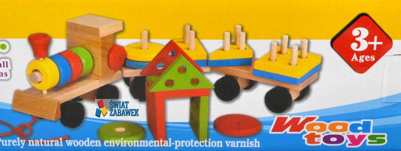 Pociąg jest wykonany z drewna. Składa się z 25 elementów: lokomotywy z dwoma bolcami i kolorowymi pierścieniami oraz dwóch wagoników i nałożonych na bolce klocków w kształcie różnych figur geometrycznych. Wagony można połączyć za pomocą plastikowych haczyków.