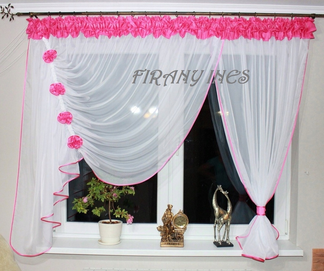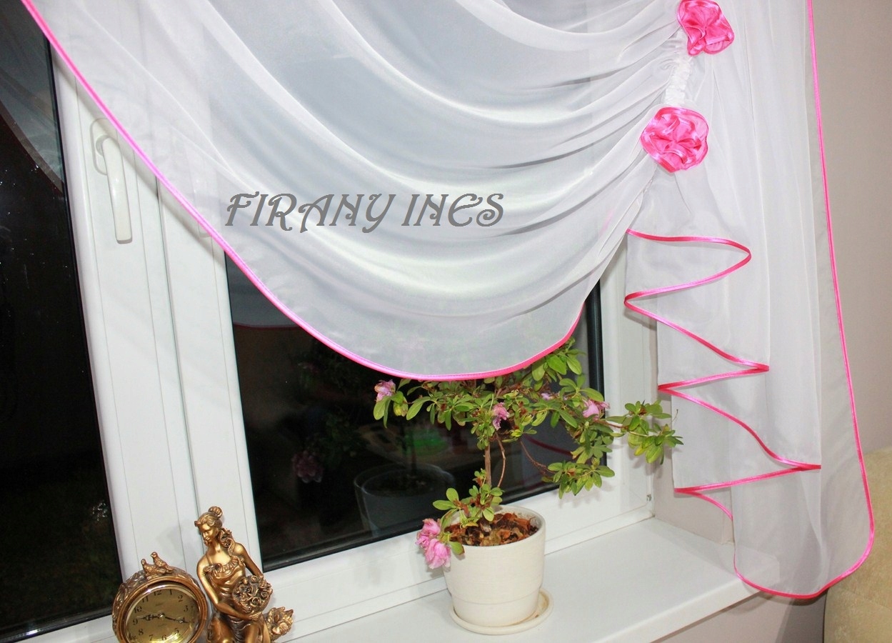 Górna częśc firanki wykączona jest ozdobną taśmą.
