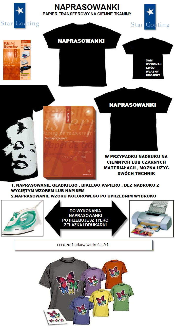 Papier Star Coating to wysokiej jakości produkt szwajcarskiego producenta, który jako jeden z niewielu na rynku zapewnia wierny wydruk na tkaninę oraz trwałość wykonanego wzoru podczas prania.Tak pożądane cechy otrzymujemy za rozsądną cenę . Star Coating to jeden z najlepszych tego typu papierów na rynku. Wykonane za jego pomocą naprasowanki dają powody do zadowolenia i satysfakcji czego i Tobie szczerze życzymy.Prasowanka wykonana przy użyciu tego termotransferu z pewnością spełni twoje oczekiwania.Teraz możesz mieć na koszulce to co Ty chcesz a nie to co ci zaproponują sklepy