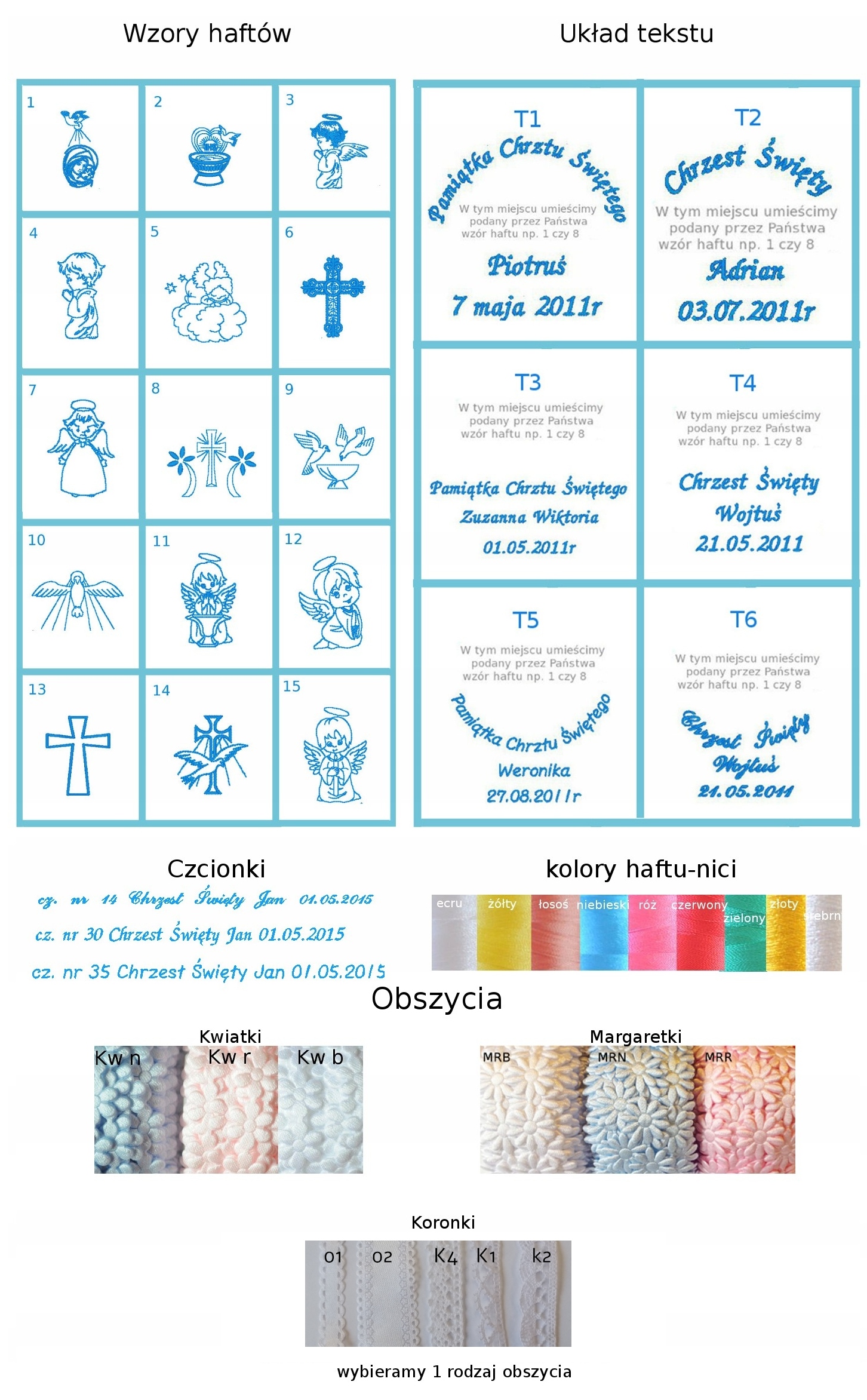 6. Kolor ozdoby: biała, biało-niebieska, biało-różowa,biało-złota, biało-srebrna, oraz jej umiejscowienie: po lewej lub na dole haftu