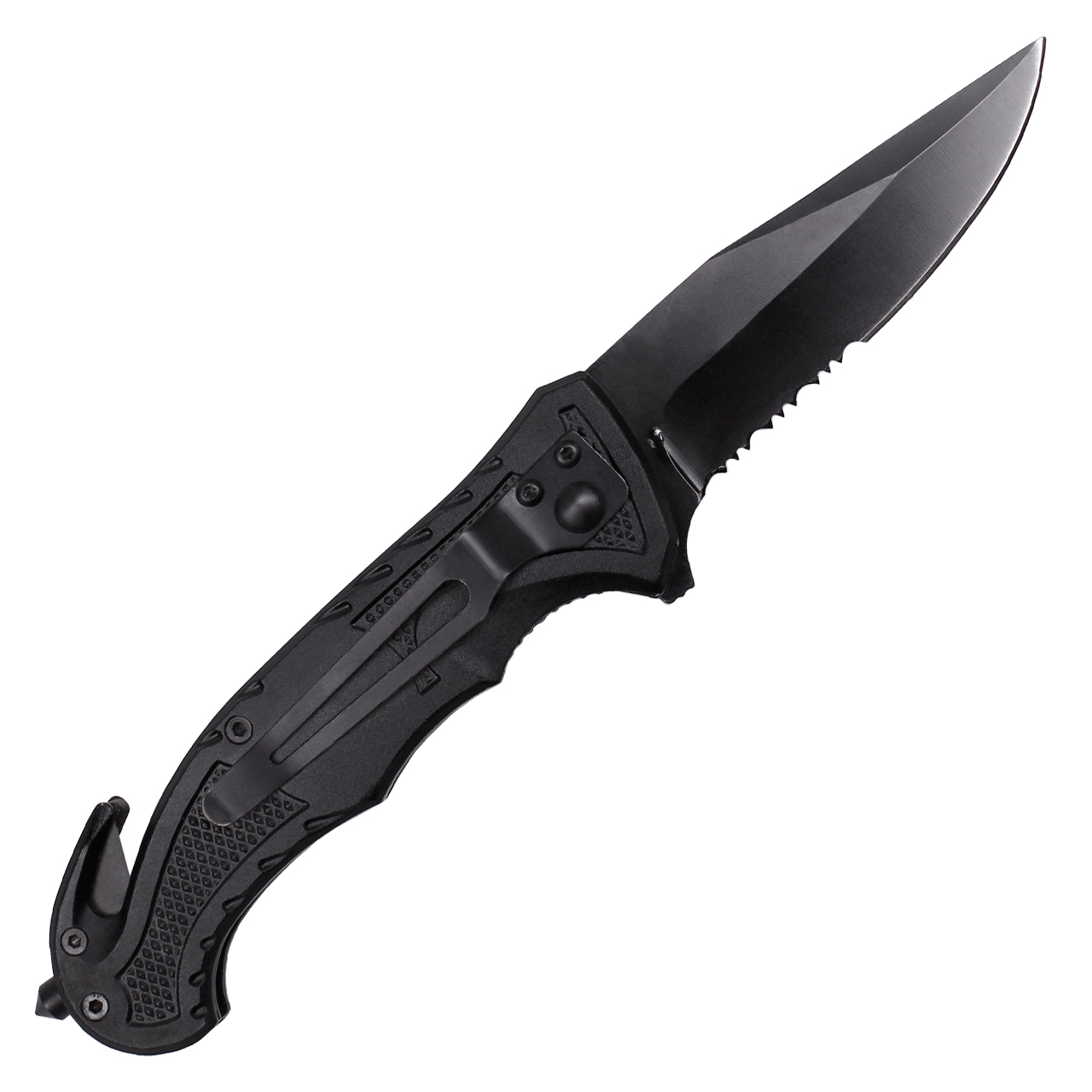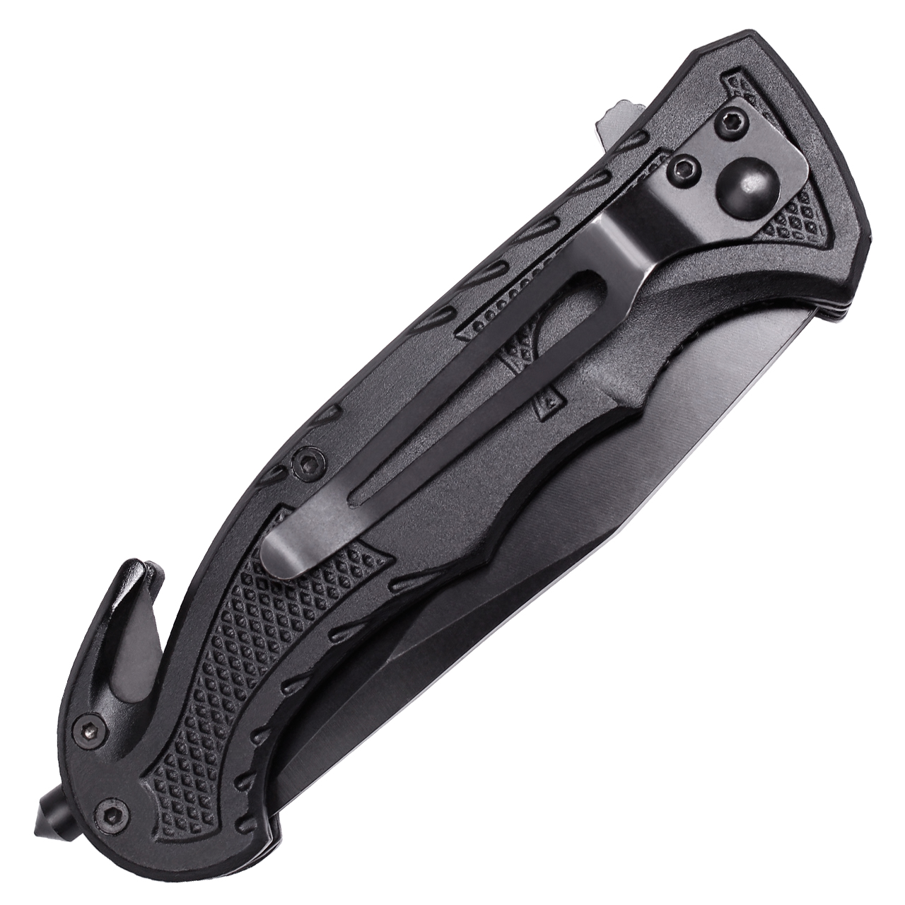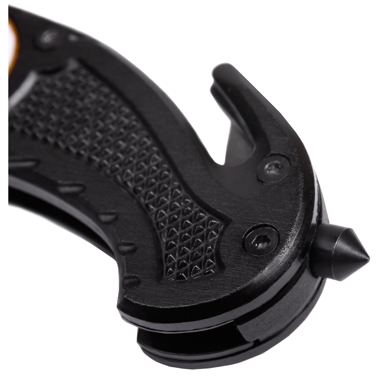 Zakończenie rękojeści posiada zbijak do szyb oraz ostry nożyk do szybkiego cięcia pasów bezpieczeństwa, kabli czy linek.
