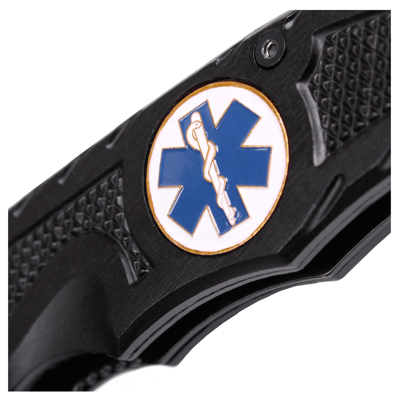 Na jednej stronie znajduje się symbol medycyny i farmacji, po drugiej praktyczny klips, dzięki któremu nóż można zaczepić nóż na ubraniu, aby zawsze był pod ręką.