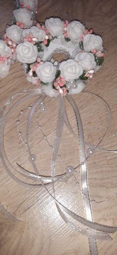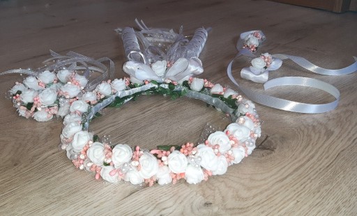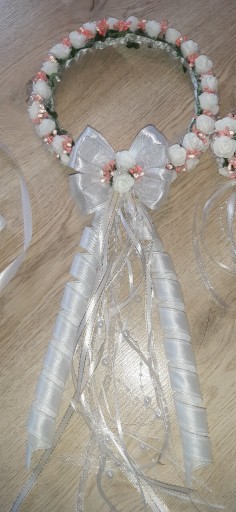 Новий регульований біло-персиковий вінок для причастя з перлами та фігурним атласним бантом із перлами на венах. У набір входить прикраса для свічки на капелюшку. Шпилька для сумки або болеро і ніжна прикраса для ручки на атласній стрічці.
