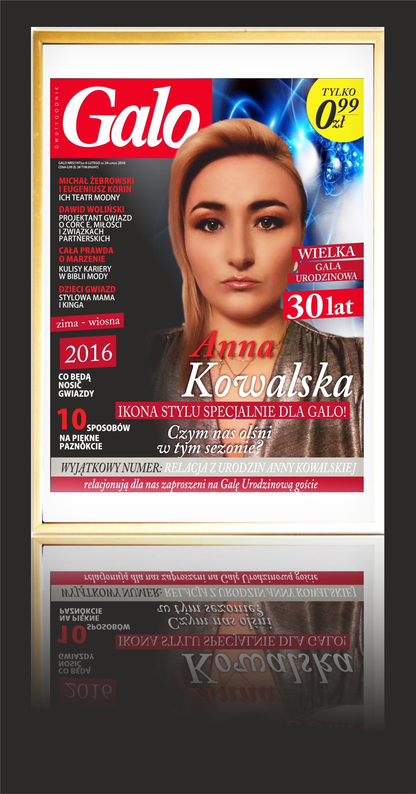 Kolorowa okładka w formacie A4 w złotej ramce, gotowa do wręczenia.