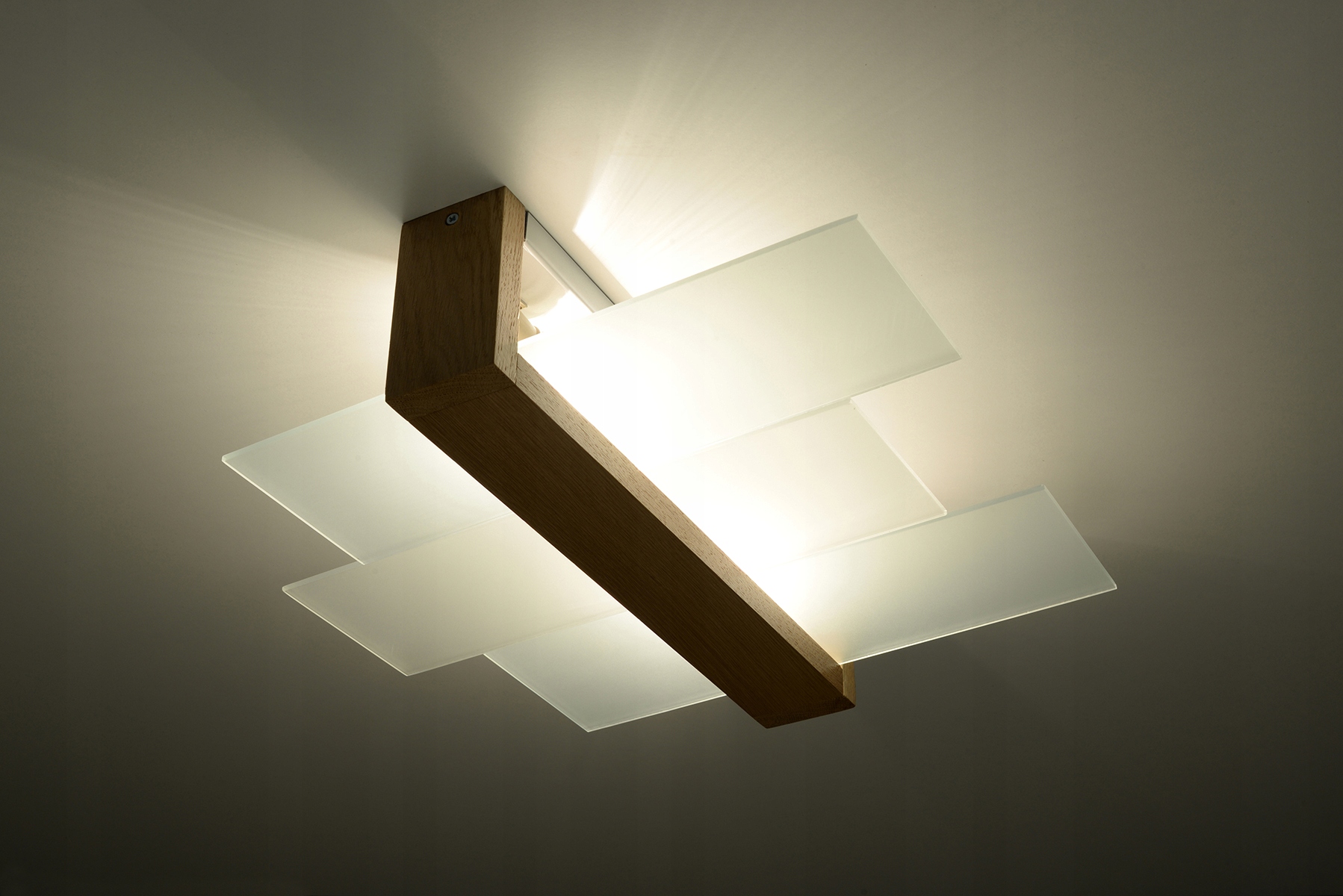 Matowy, szklany klosz drewnianej lampy sufitowej doskonale rozprasza światło, dzięki czemu dociera ono we wszystkie zakątki pomieszczenia, a Ty z łatwością uzyskujesz pożądany efekt wizualny.