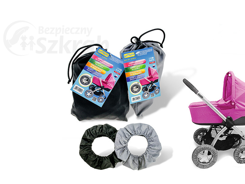 Komplet 4 szt. praktycznych pokrowców na kółka wózka dziecięcego. Dzięki ochraniaczom utrzymasz czystość i higienę w domu, mieszkaniu lub samochodzie.