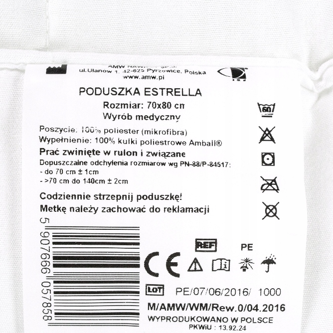 Wyroby AMW to linia produktów, które doskonale spełniają najwyższewymagania jakościowe i użytkowe. Pranie w wysokich temperaturach całkowicie eliminuje szkodliwe drobnoustroje i roztocza, dzięki czemu doskonale sprawdza się dla dzieci ze skłonnościami alergicznymi. Produkt posiada certyfikat OEKO-TEX Standard 100, co gwarantuje najwyższą jakość.