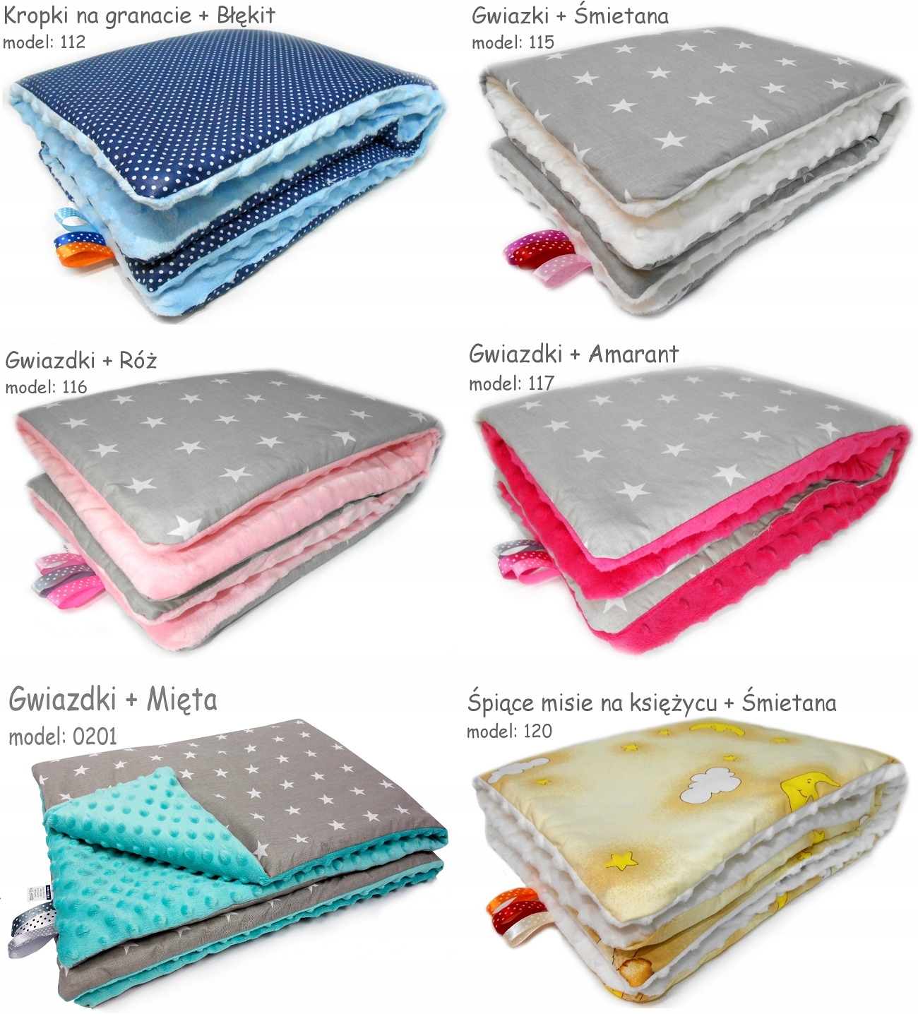 Komplet prać w 30°, nie używać wybielaczy, nie prasować po stronie materiału Minky.