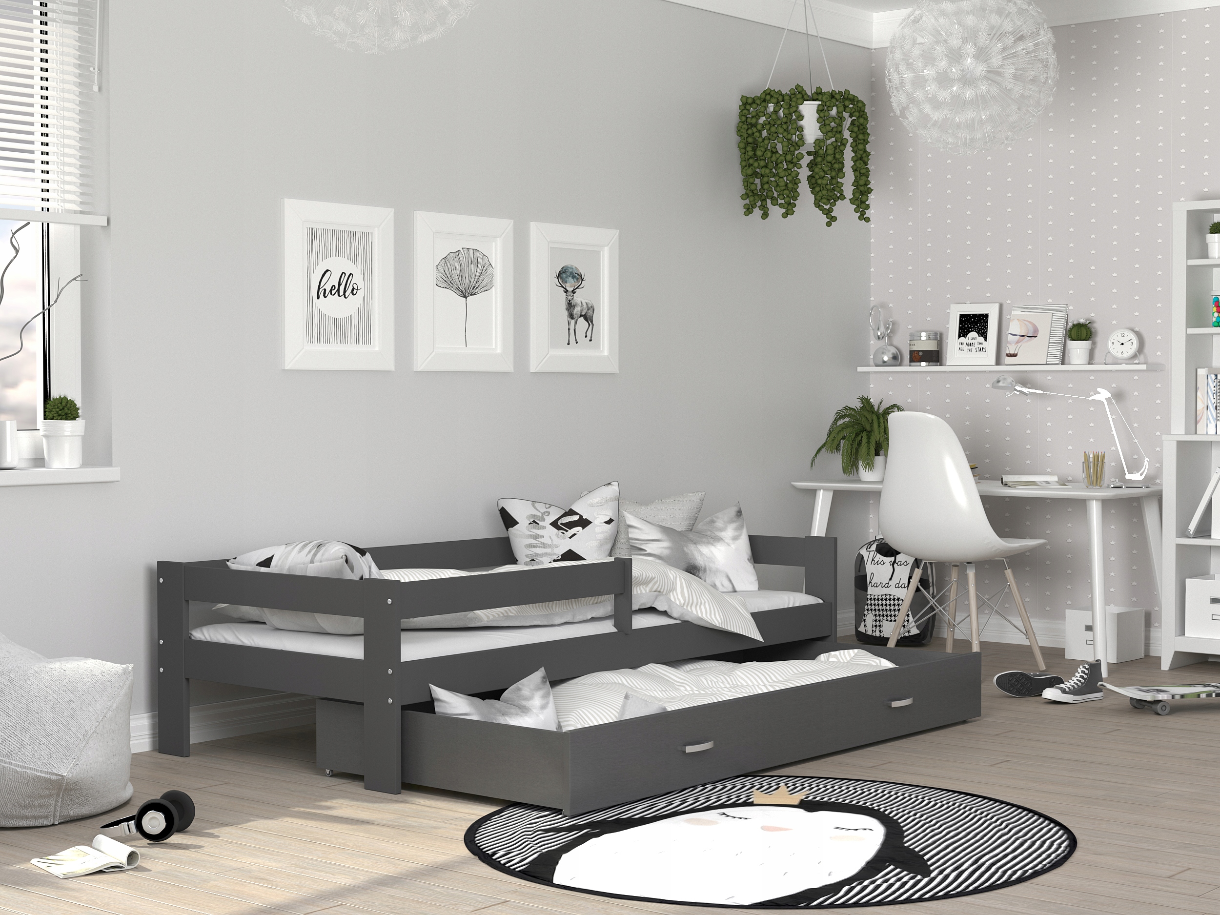 - Do każdego łóżka dołączamy pojemną szufladę z płyty meblowej mogącą służyć jako pojemnik na pościel lub zabawki. Szuflada jest oddzielnym elementem łóżka.