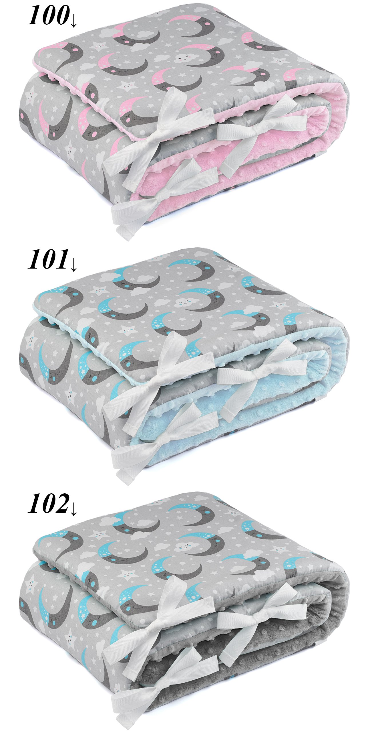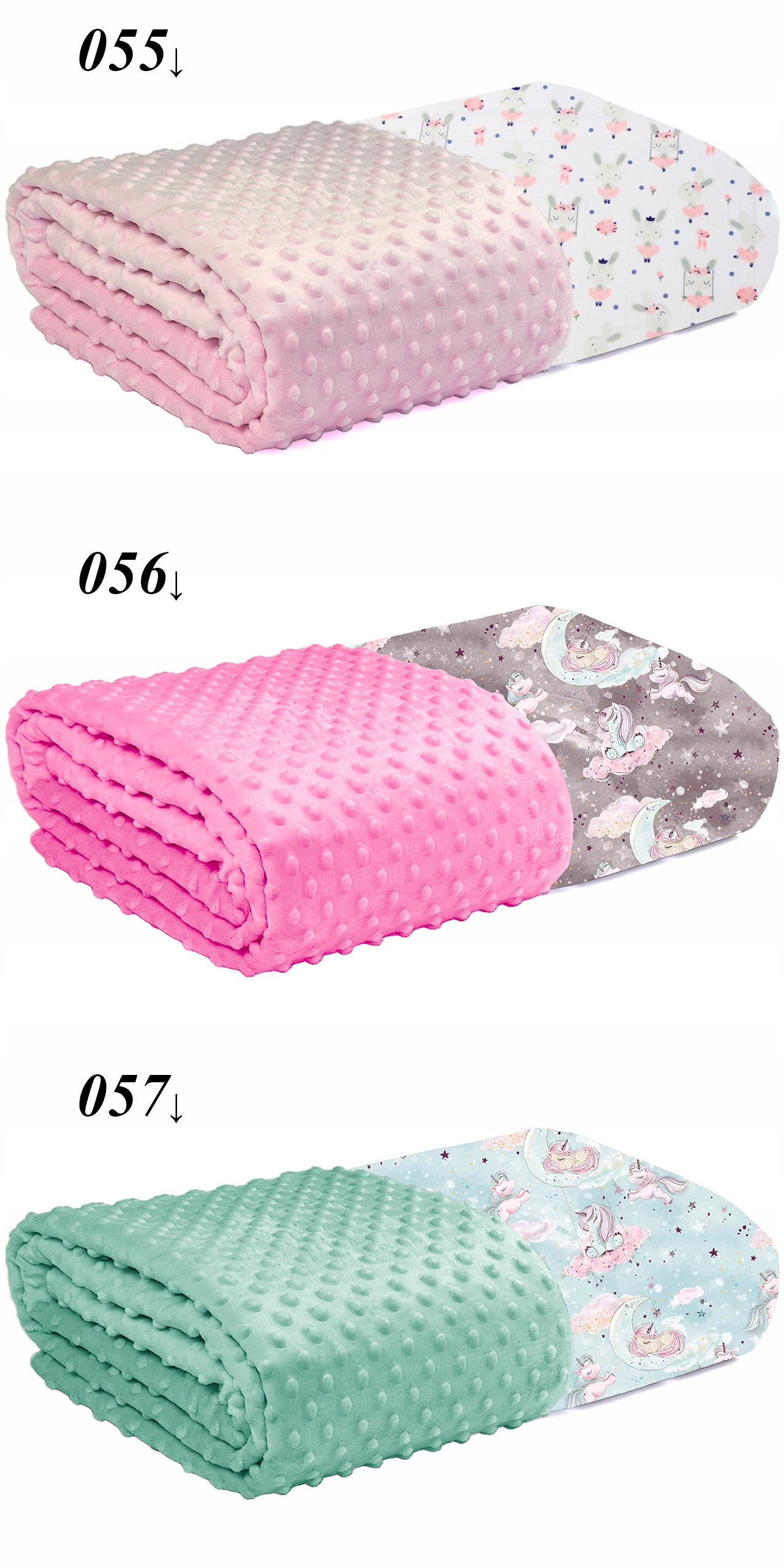 - Minky o gramaturze do 560g (waga minimum 520g, 330g/m2). Wysoka jakość Minky gwarantuje, że tłoczone kropeczki nie znikną nawet po wielu praniach. W przeciwieństwie do tańszego zamiennika (o niższej wadze) nasza tkanina jest gęsto tkana, bardzo przyjemna w dotyku i nie jest tak rozciągliwa.
