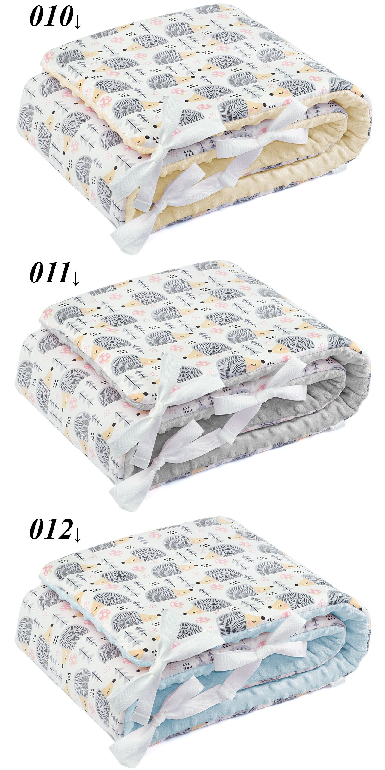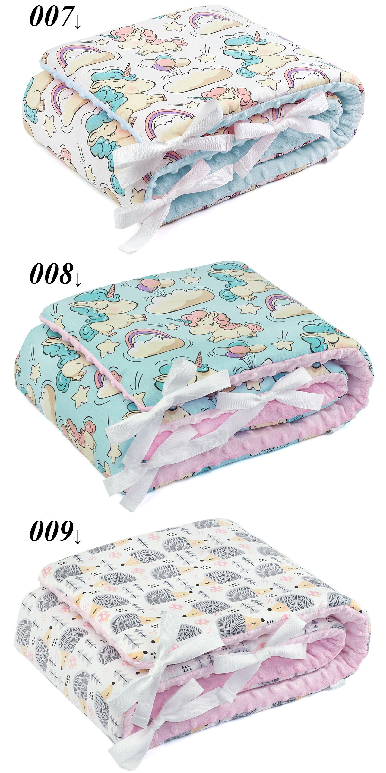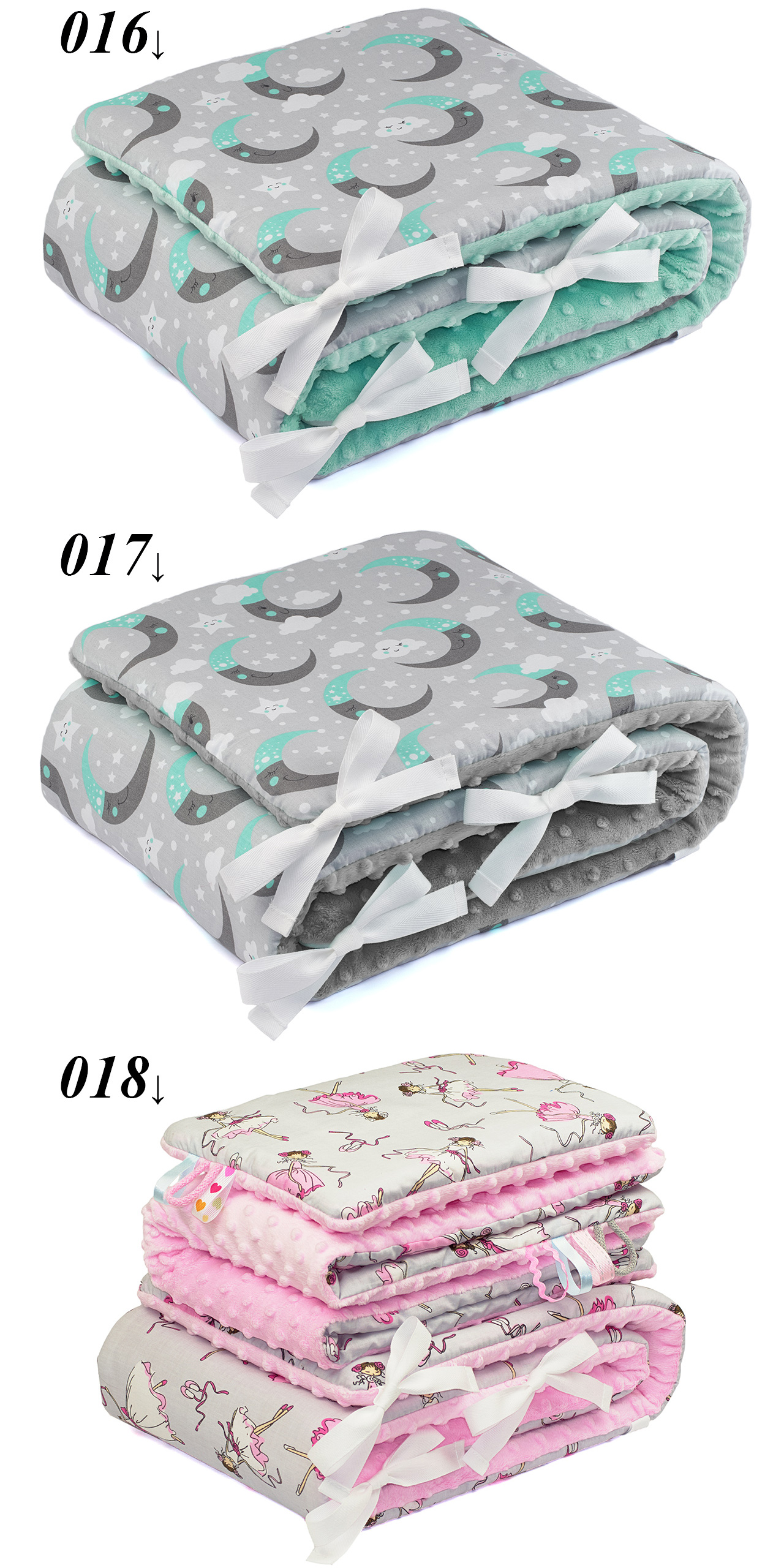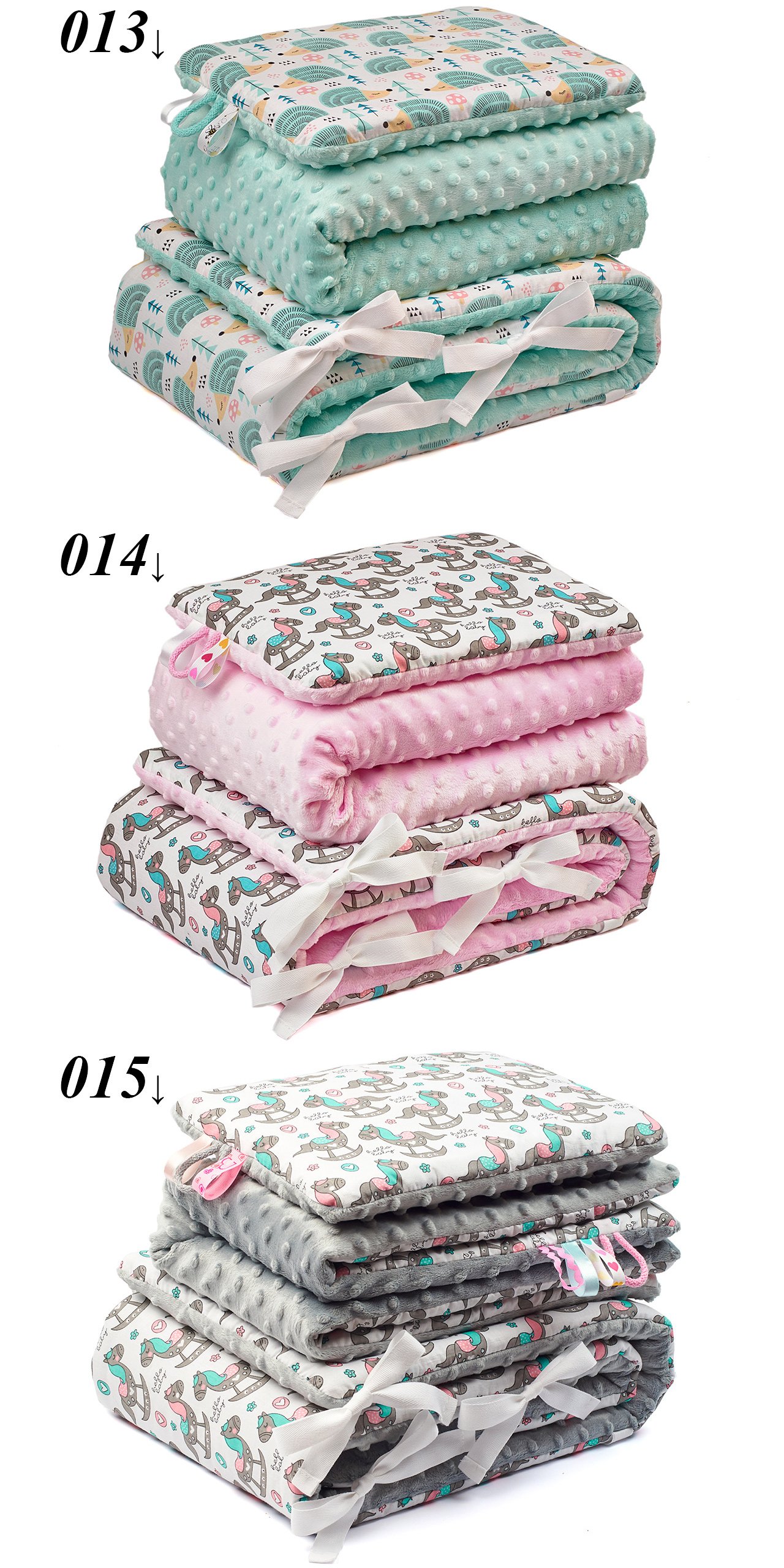 Poduszki oraz kocyki nie posiadają ozdobnych tasiemek (nawet jeśli na zdjęciach są widoczne). Tasiemki wszywamy tylko na życzenie (bez dopłaty).