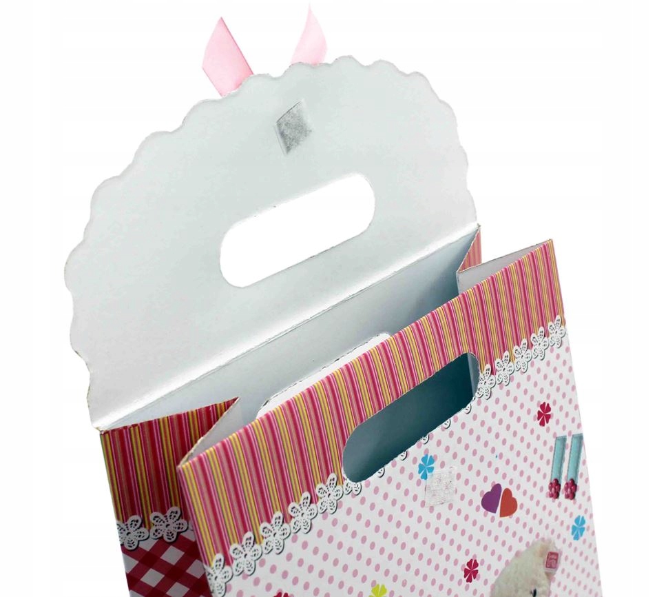Torba wykonana z matowego papieru o gramaturze 210 g/m2 zadrukowanego w całości ozdobnym nadrukiem. Papier o dużej wytrzymałości ze wzmocnionym dnem. Bardzo duża grubość i sztywność materiału - torebka stoi i utrzymuje kształt samodzielnie.