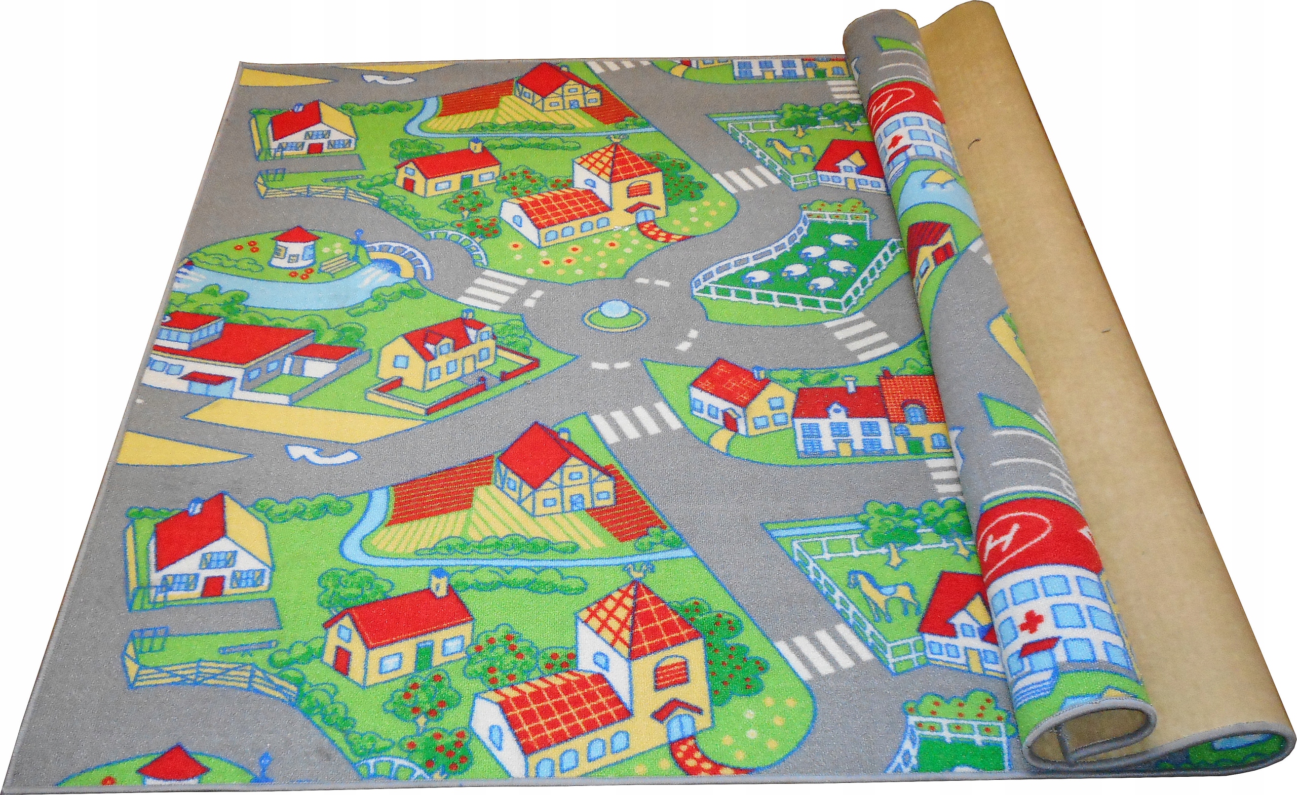 Kolorowy dywanik przedstawiający zabudowę wiejską z drogami, domkami, rzeką, przejściem dla pieszych, szpitalem, zagrodą dla owieczek.