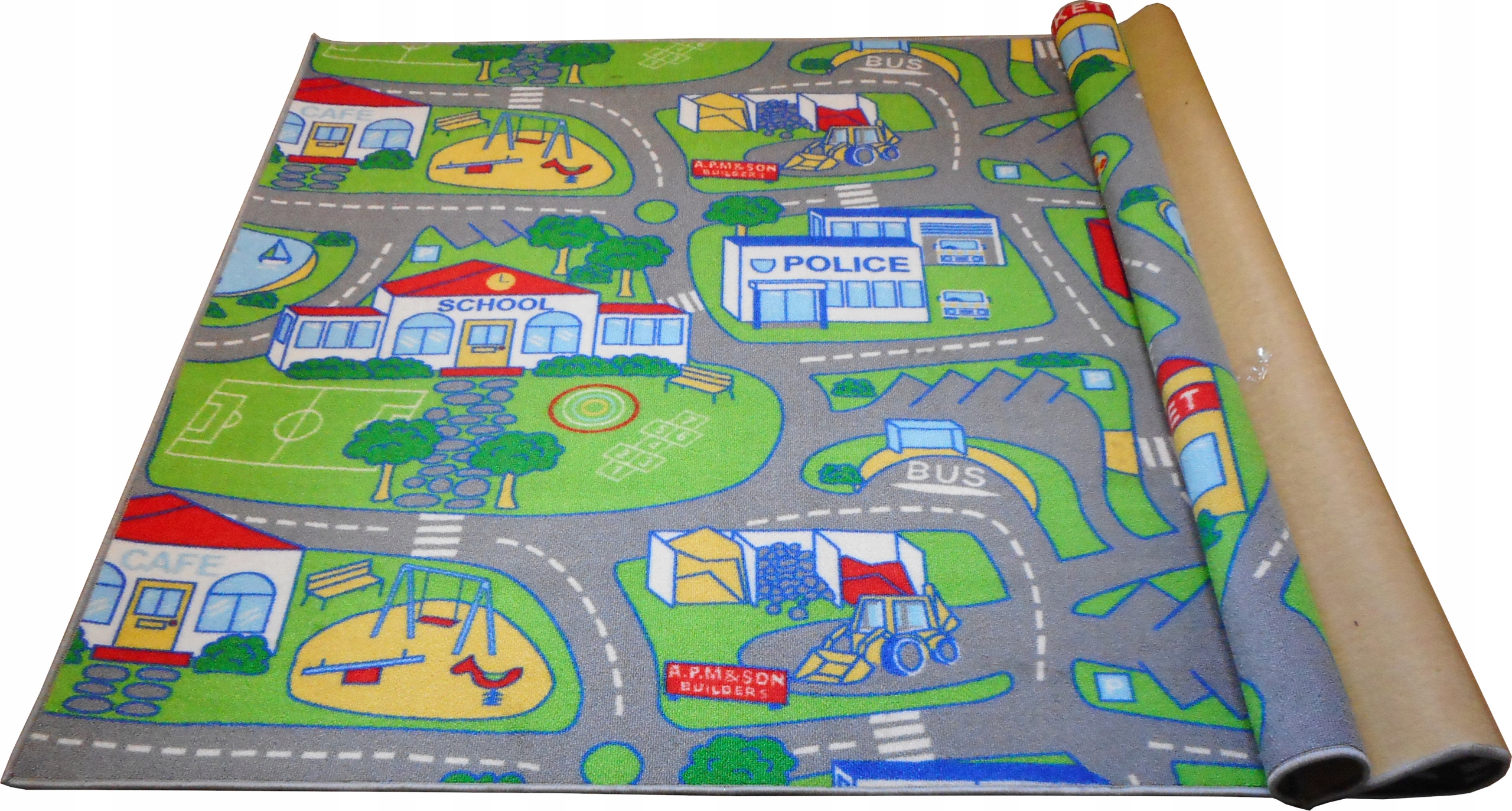 Kolorowy dywanik przedstawiający zabudowę miejską policja, straż pożarna, szkoła, market oraz plac budowy z koparką.