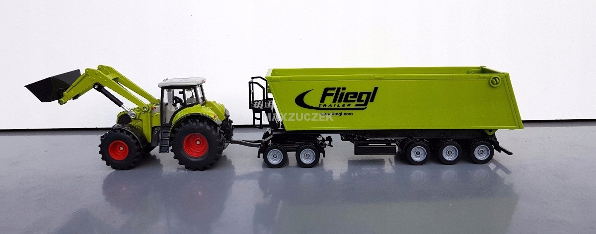 Zestaw składający się z ciągnika z ładowarką i wywrotki. Ciągnik marki Claas Axion 850 z ładowarką ciągnie 3 osiową wywrotkę Dolly. Wywrotka Dolly może być łączona z dowolnymi ciągnikami z serii SIKU. Możliwość otwarcia tylnej klapy. Model metalowy z elementami plastikowymi. Bardzo starannie wykonany z dbałością o wszelkie szczegóły.