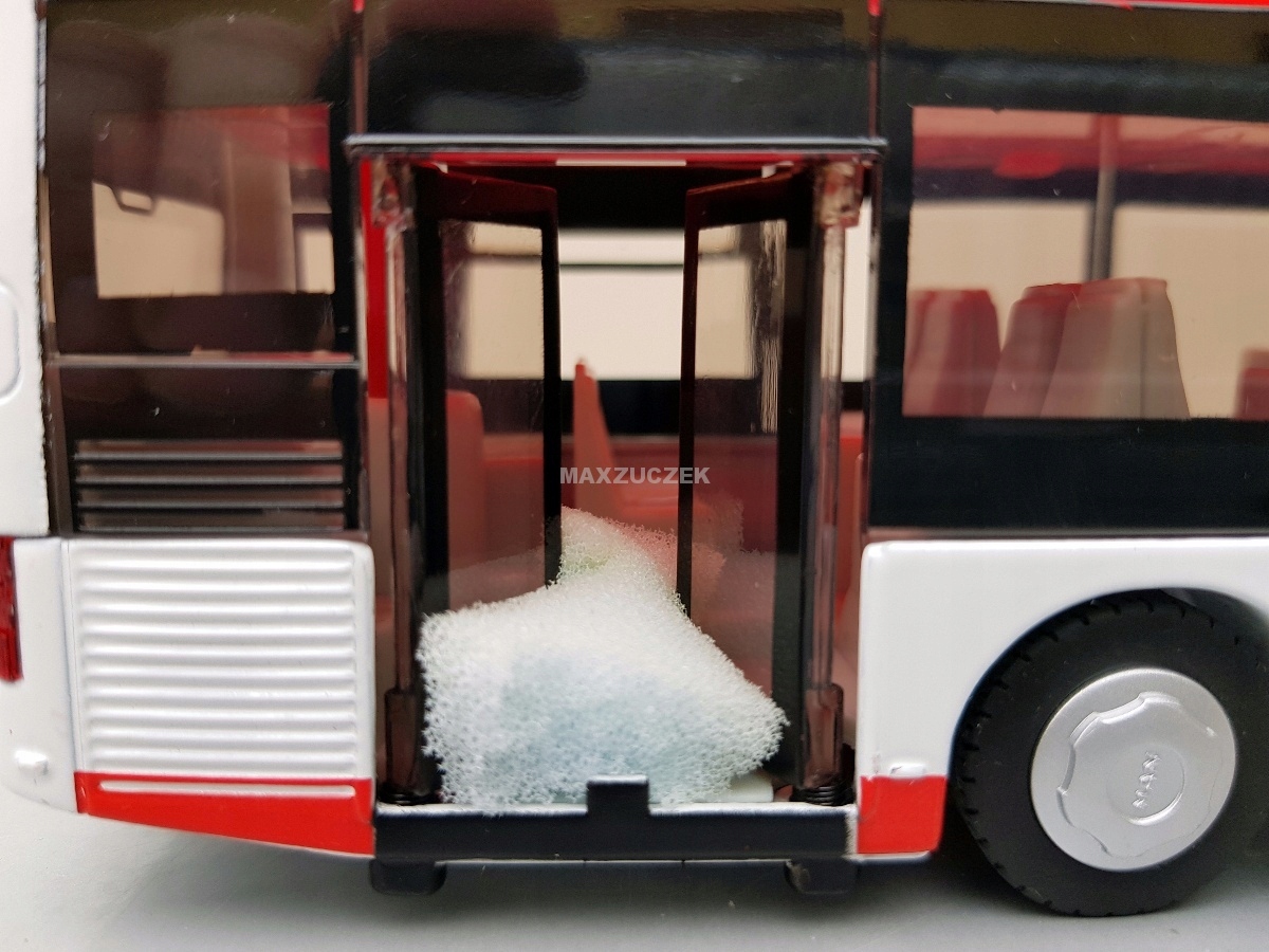 Szczegółowo odwzorowany model autobusu marki MAN w skali 1:50. Model posiada otwierane drzwi ( przednie i tylne), przyciemniane szyby oraz otwieraną pokrywę silnika.