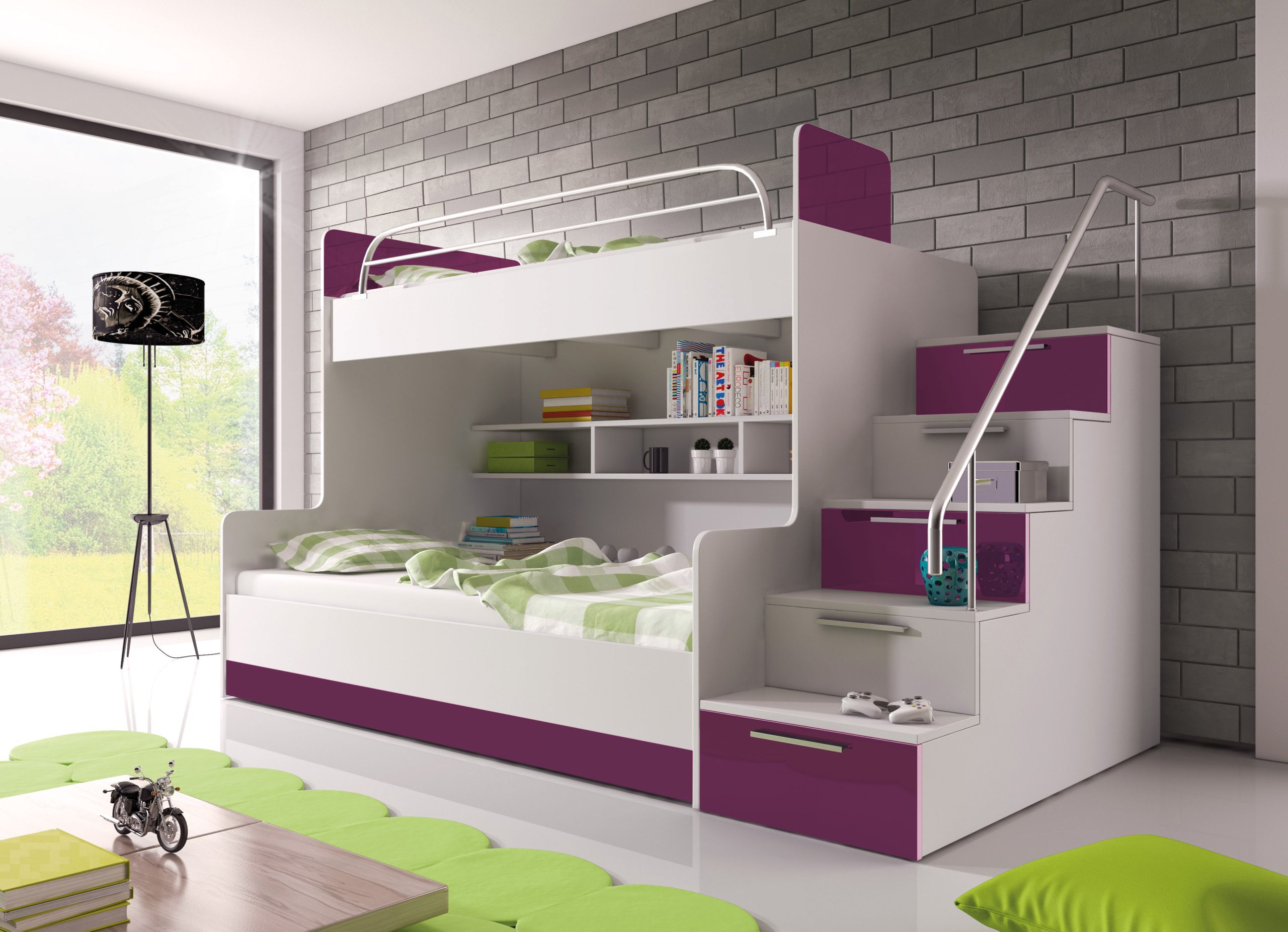 Łóżko cechuję się nowoczesnym wzornictwem oraz precyzyjną jakością wykonania, zapewnia wyjątkowo dobry sen oraz gwarancję bezpieczeństwa i pewność, że Twoje dziecko obudzi się wypoczęte. Fronty zestawu są wykonane z płyty meblowej MDF na wysoki połysk w bogatej kolorystyce, która pozwoli dopasować mebel do każdego pokoju. Górna powierzchnia spania oraz schodki przy łóżku wyposażone są w barierki, chroniące twoje dziecko przed wypadnięciem.