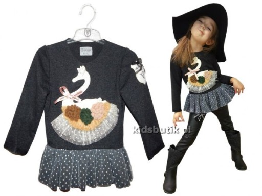 Чудоватуніка з баскоюта унікальну пришиту дивовижну аплікаціюлебідьз колекції відомого виробника одягу, адресована особливо молодим жінкам. Виготовлена з приємної та еластичної світшотної тканини в поєднанні з фатиновою спідницею в крапку - що разом дає дивовижний ефект. Ідеально підібрана аплікація лебідь не тільки привертає увагу, але й надає їй неповторний характер. На одному з рукавів нашита нашивка/вимпел з бантом - підписана логотипом бренду.