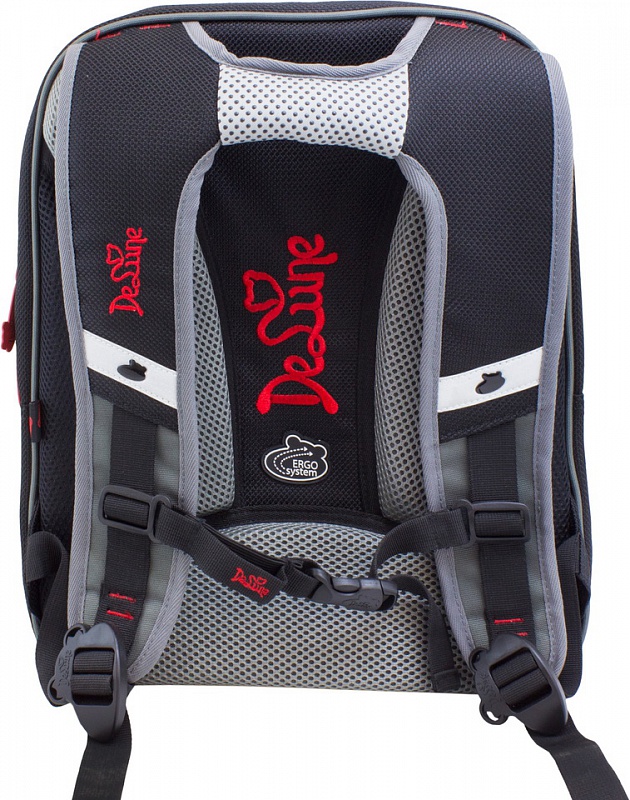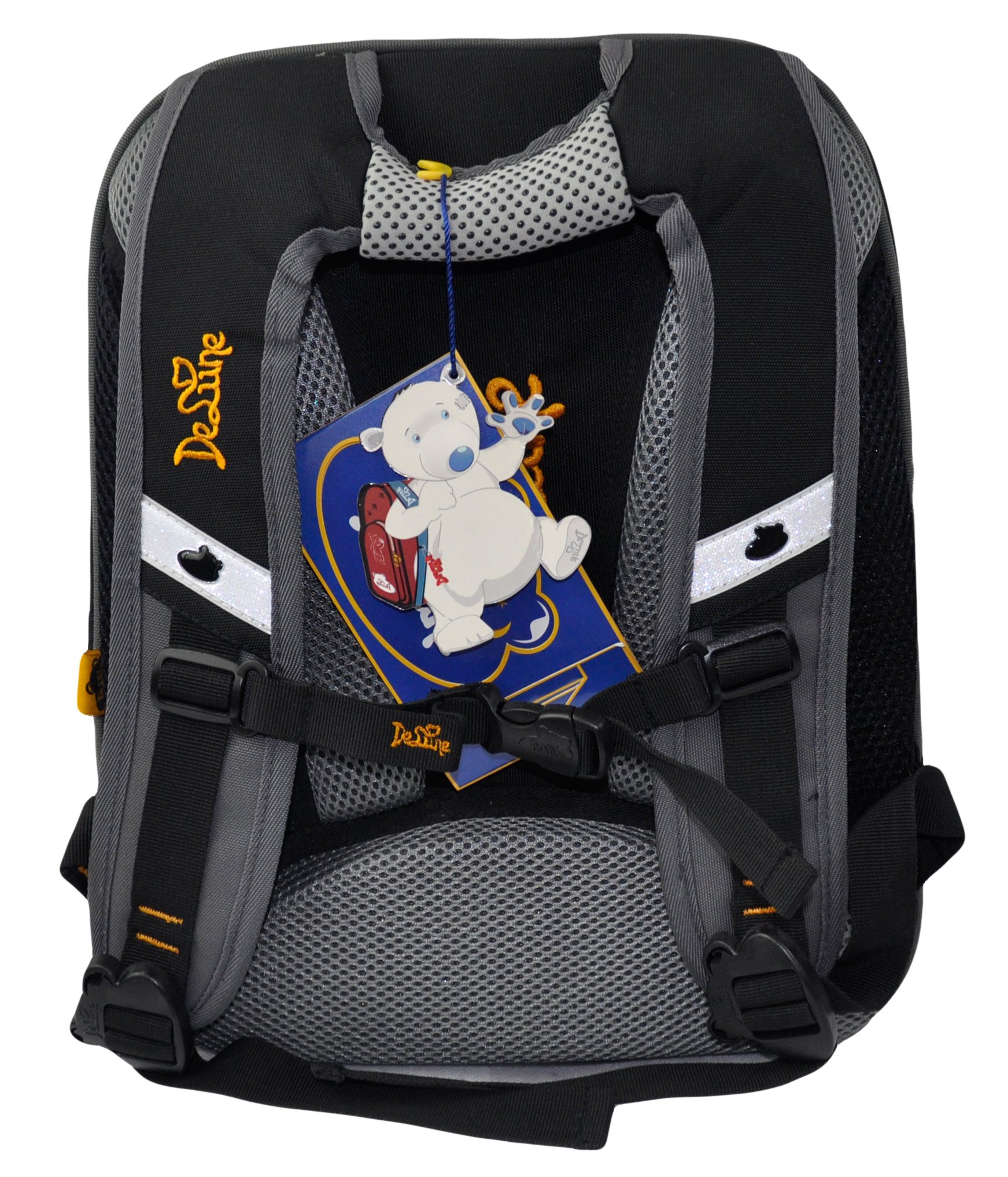 Tornister wyposażony jest w Ergo System - system oddychających pleców. Na regulowanych rączkach umieszczono elementy odblaskowe, gwarantujące bezpieczeństwo po zmierzchu. Plecy tornistra posiadają elastyczną, miłą w dotyku siatkowaną gąbkę. Dodatkowo tornister posiada pas biodrowy , pełniący funkcję stabilizującą.
