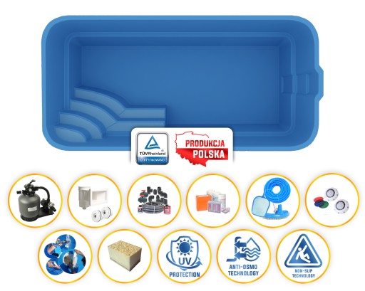 Басейн виготовлений з кращих європейських матеріалів, призначених для басейнової індустрії, завдяки чому басейн повністю стійкий до впливу хімікатів басейну, УФ-випромінювання та перепаду температур. Басейни з ламінату цільні, не зварені, не з'єднані та не склеєні - що запобігає протіканню басейну.
