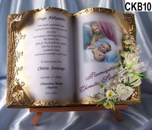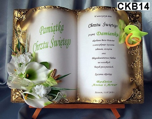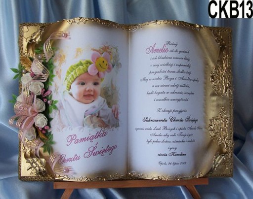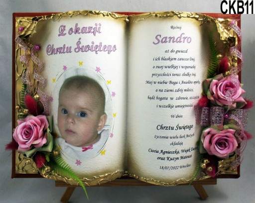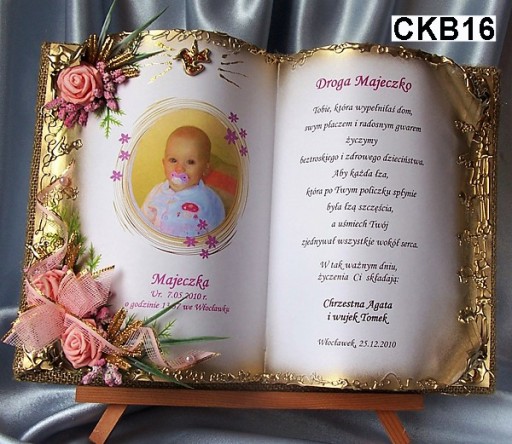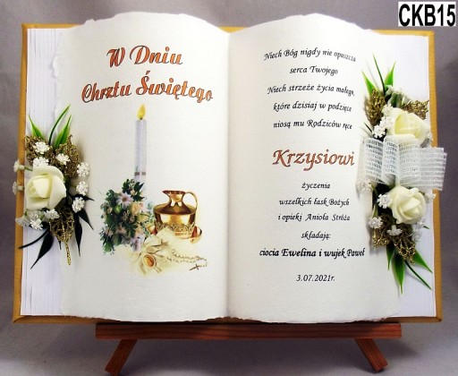 у формі обставинної книги, якаВиготовляємо повністю вручну в техніці просторового оформлення колаж - художнє рукоділля, красиво упакований, на якому ми розміщуємо персоналізований текст побажань на головній сторінціз нагоди Таїнства Святого Хрещення- ім'я дитини, дата хрещення, місто, якщо є, та в підписі особи, яка складає побажання.Прикрашаємо все красивою просторовою композицією з тканинних квітів.