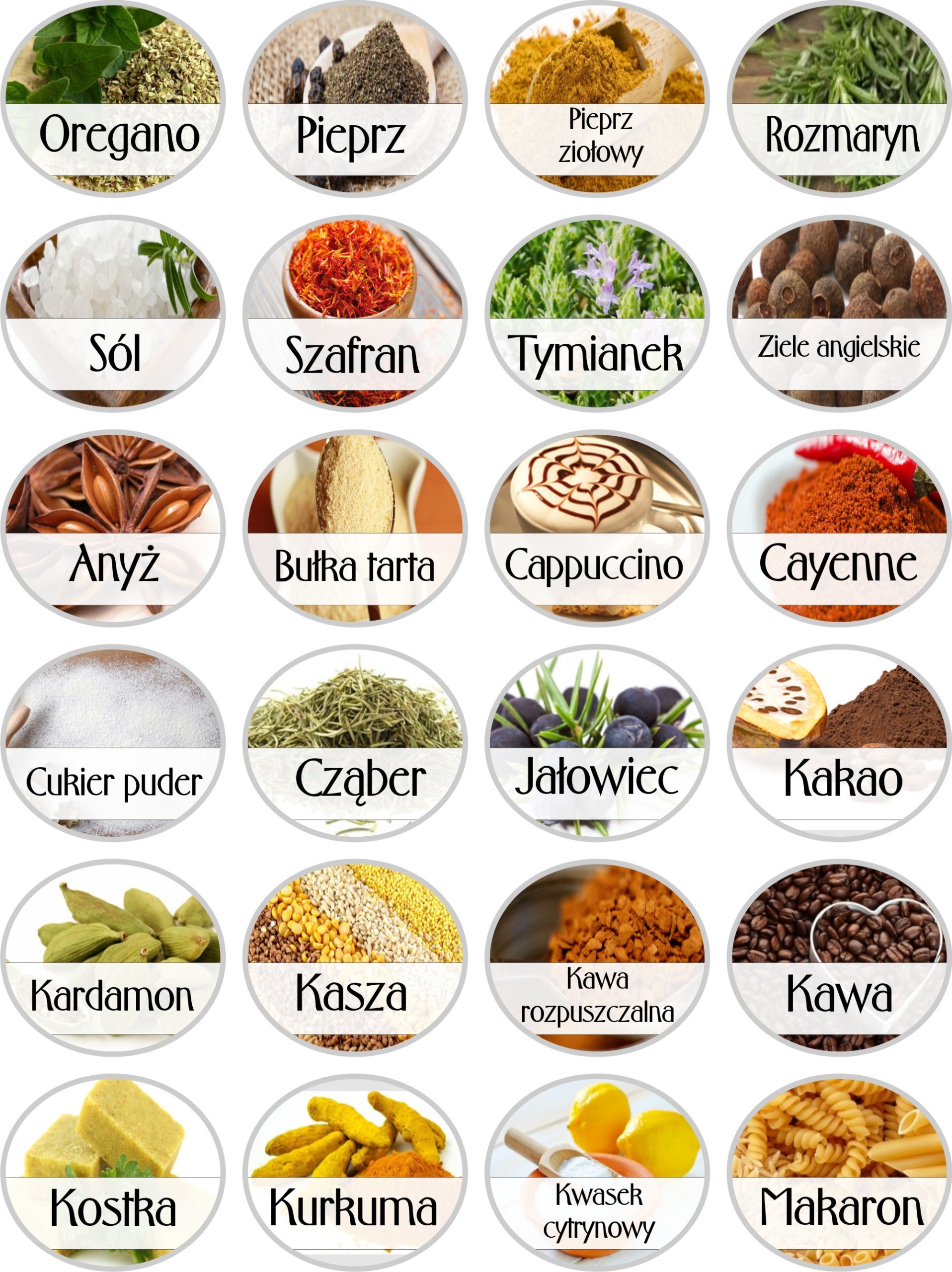 Aukcja dotyczy ZESTAWU 92 naklejek na przyprawy o wymiarach: szerokość 40 mm, wysokość 35 mm.
