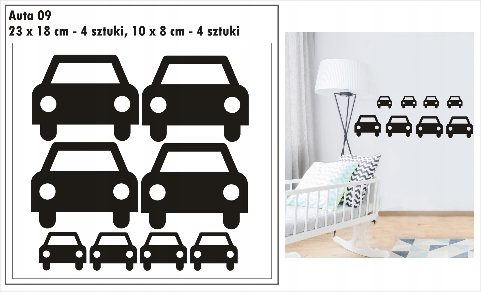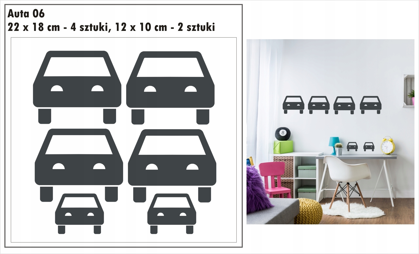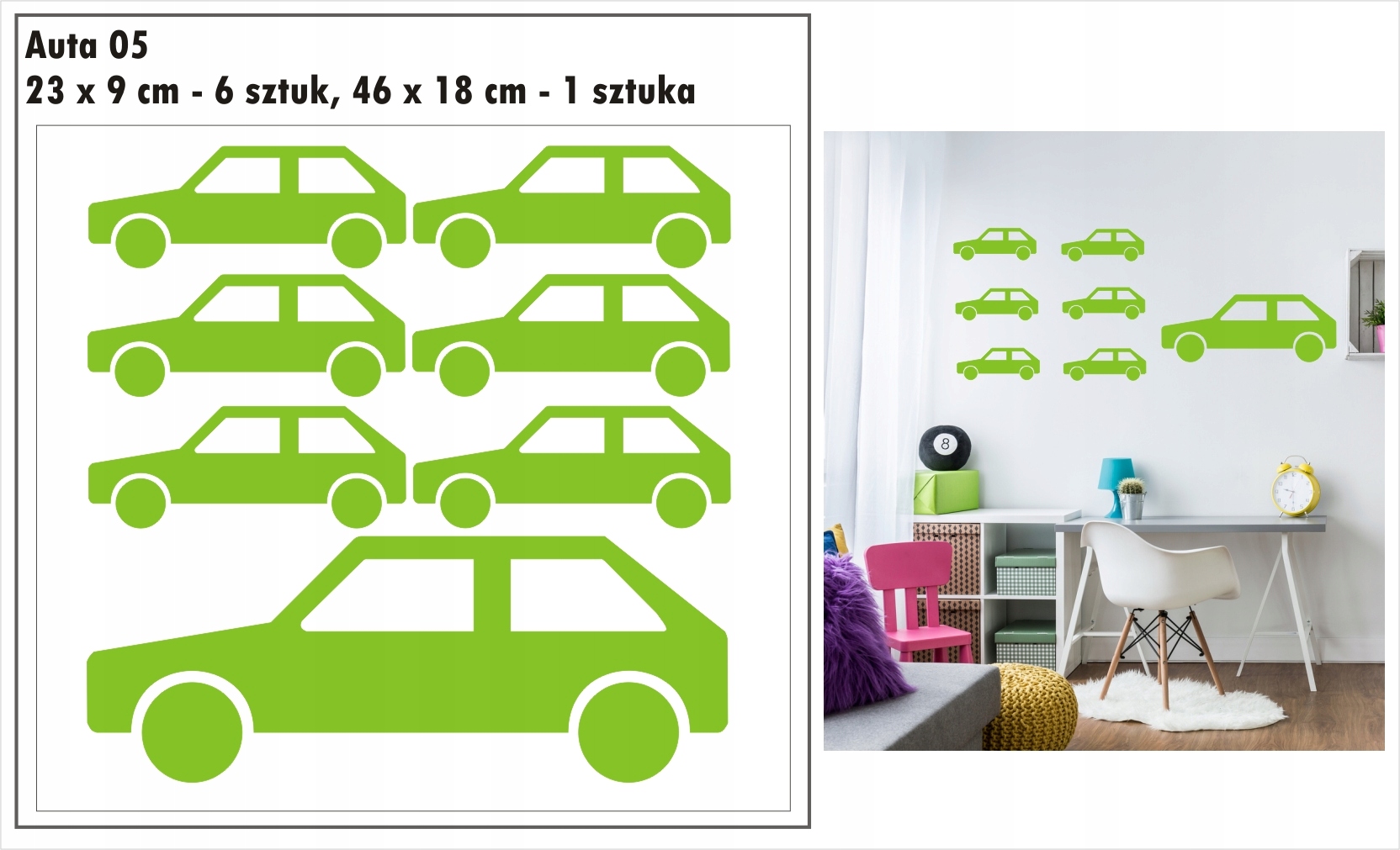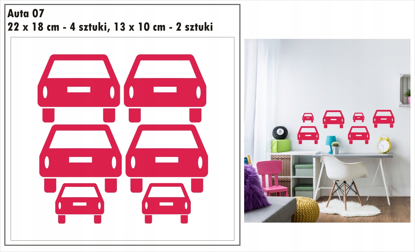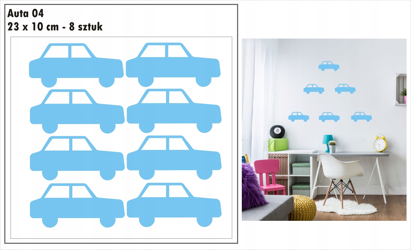 Przedmiotem aukcji są jednokolorowe naklejki auta, samochodziki.