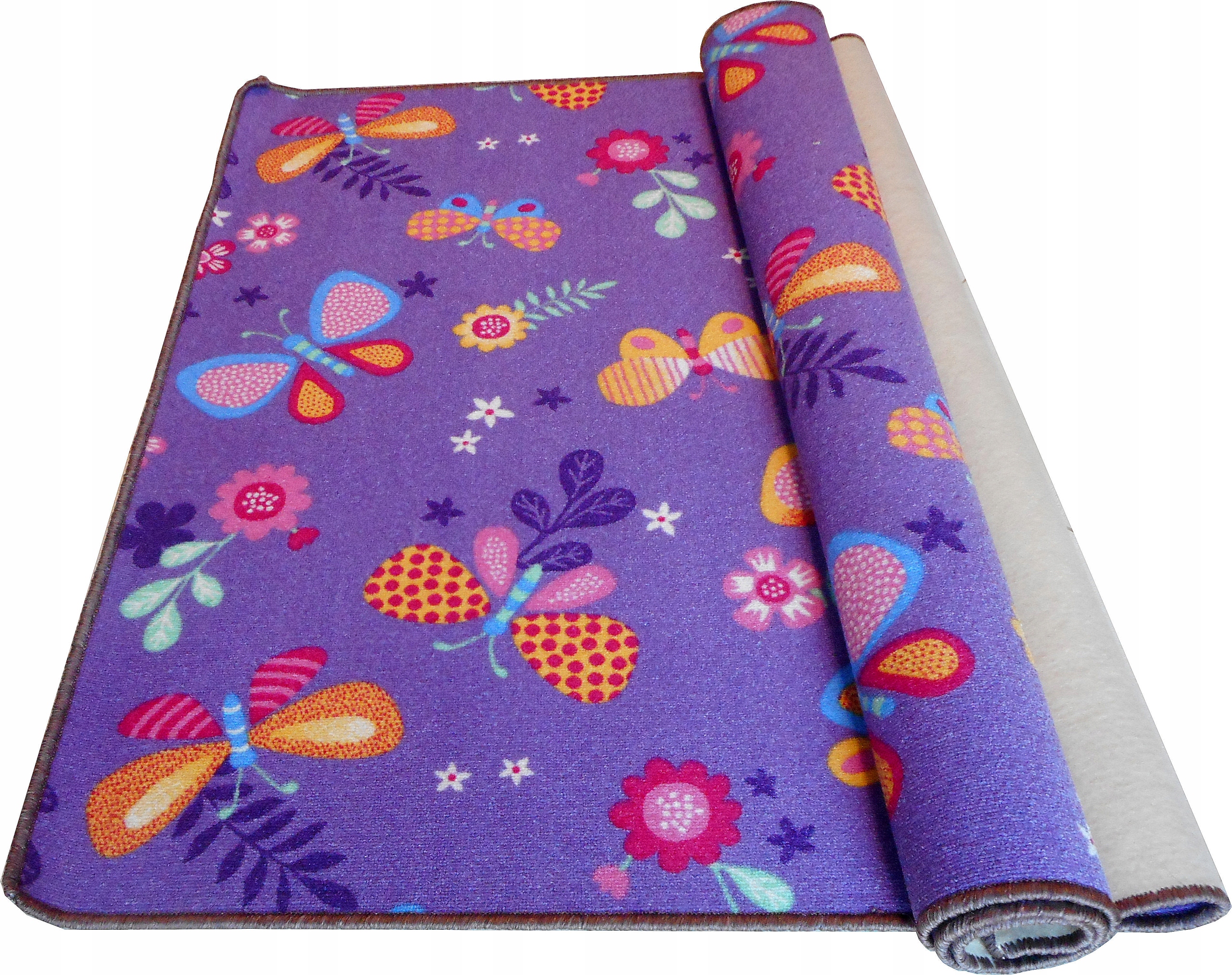 Śliczny dywanik w fioletowej tonacji z kolorowymi motylkami i kwiatkami.
