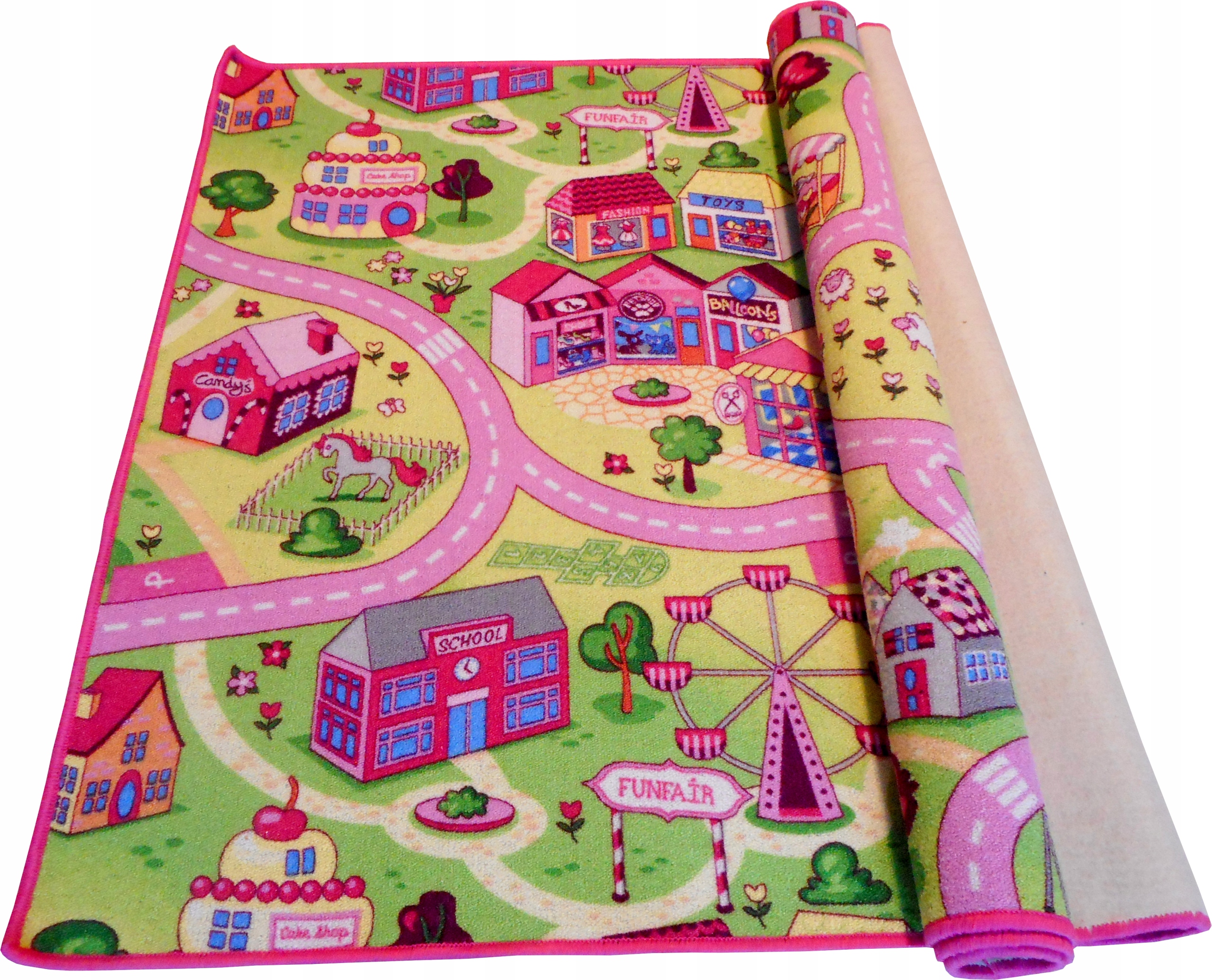Dywan przeznaczony dla dziewczynek przedstawiający różowe uliczki w słodkim miasteczku. Na dywaniku można znaleźć budynki w różowej kolorystyce.