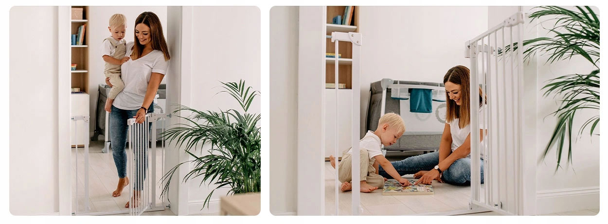 Szeroki zakres od 75 do 85 cm pasuje do większości standardowych framug. Specjalna nakładka umożliwia przedłużenie barierki aż do 105 cm. Po dołożeniu dodatkowego rozszerzenia bramkę można stosować również w celu zabezpieczenia schodów.